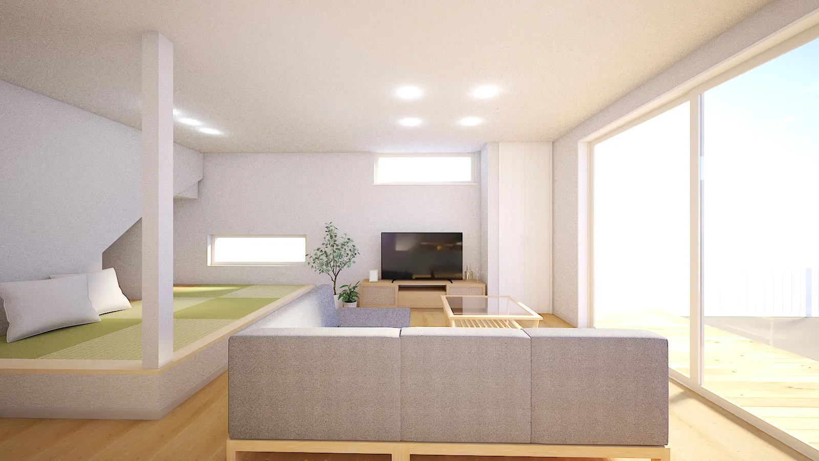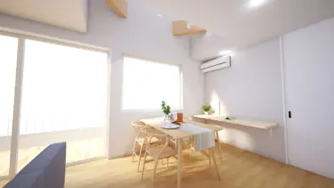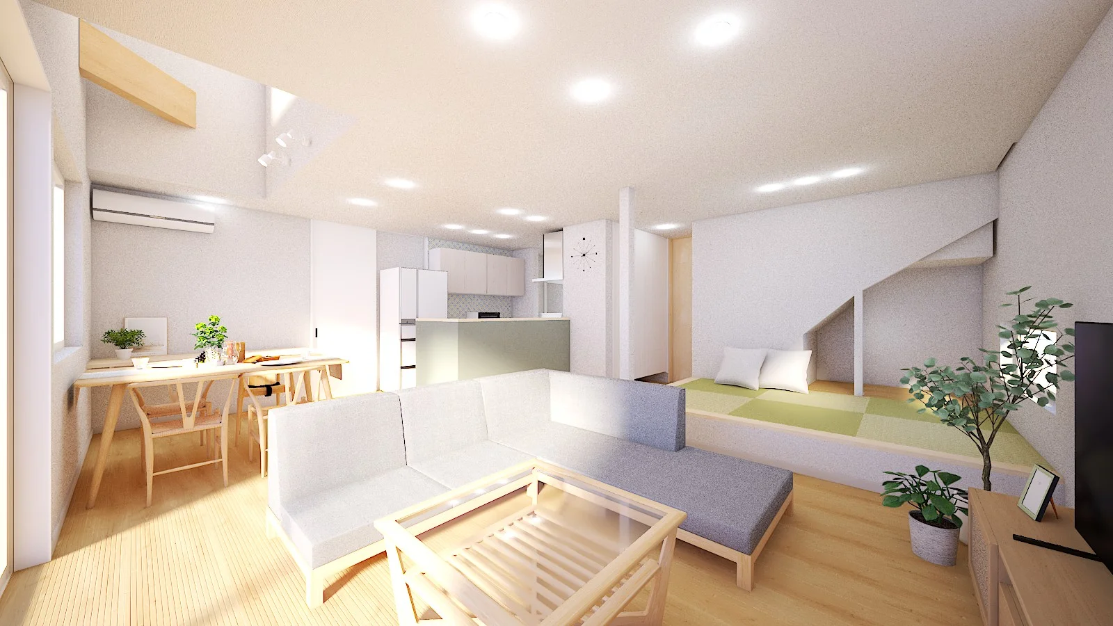 吹き抜けのある明るいダイニングと、小上がり和室がひと続きになった開放感あふれるLDK。