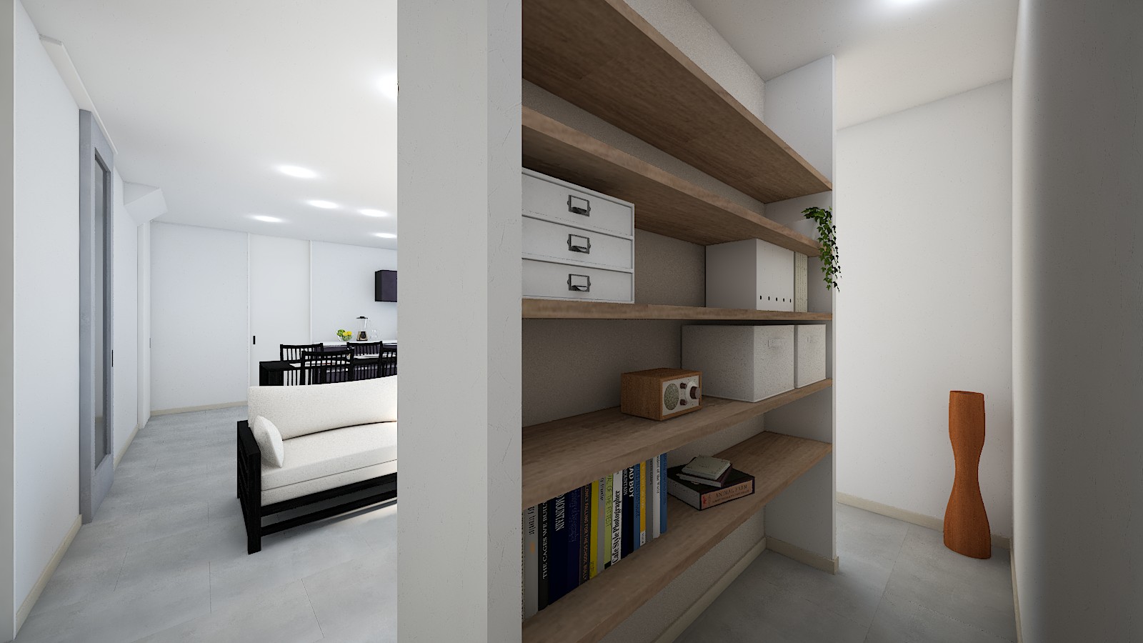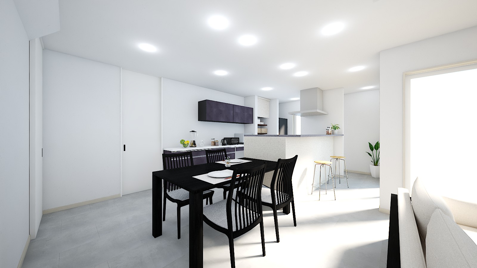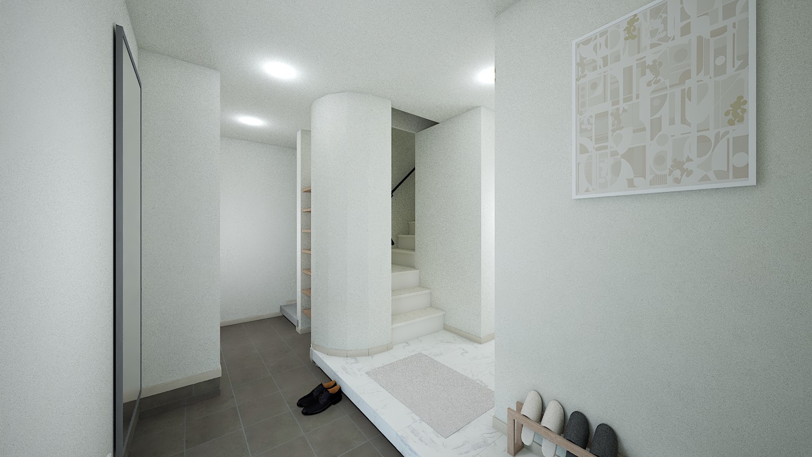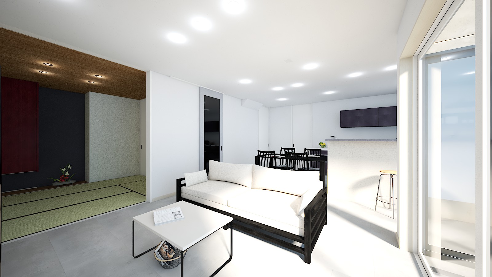 室内はコンクリート調のグレーの床、明るさを抑えたホワイトの建具でホテルライクな内装を演出!