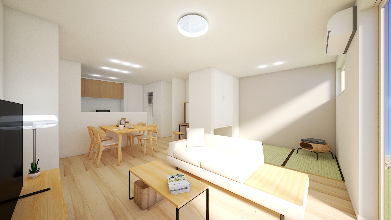 リビング横にはゆったりとくつろげる畳スペースを設け、家族みんなが思い思いに過ごせる空間に