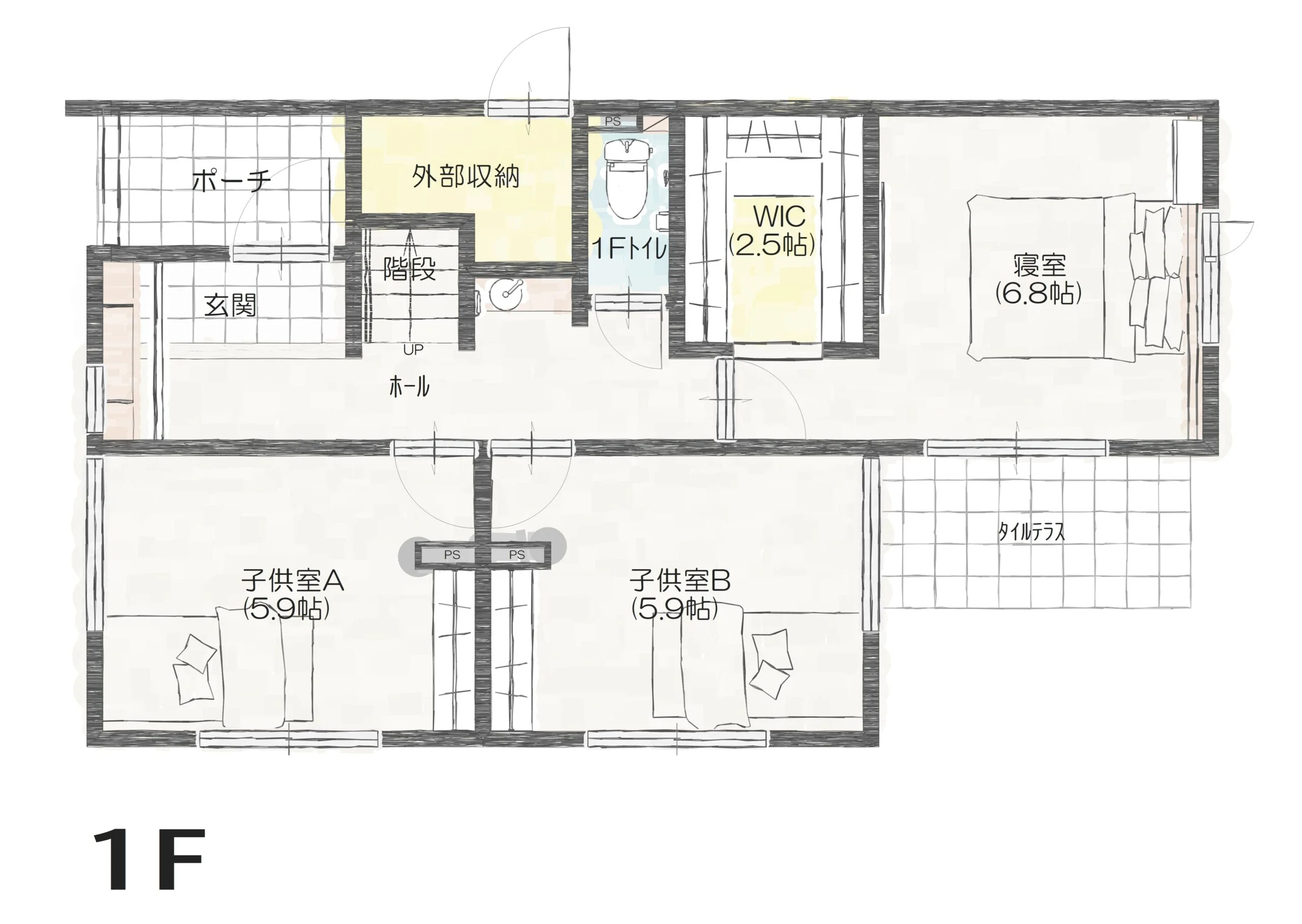 寝室や子ども部屋などの居室は1階にまとめ、LDKと水まわりは2階へ配置