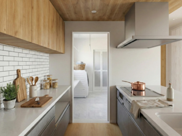 キッチンからランドリールームへ直結する回遊動線を採用。料理・洗濯・お風呂掃除が数歩の移動で完結します。