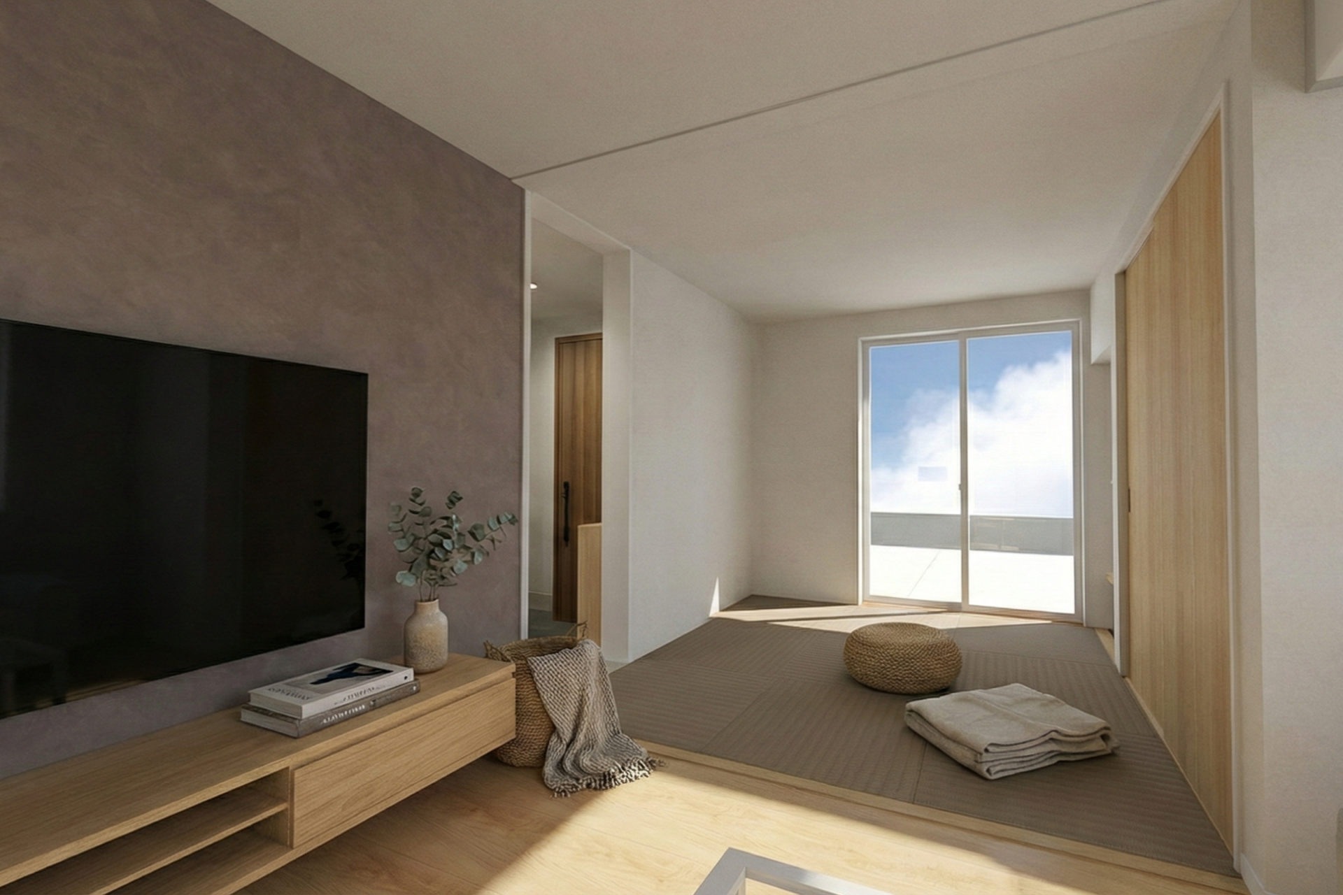 和室はロールスクリーンを開ければLDKと一体化。子どもの遊び場やお昼寝スペースとしてもフレキシブルに活用できます。