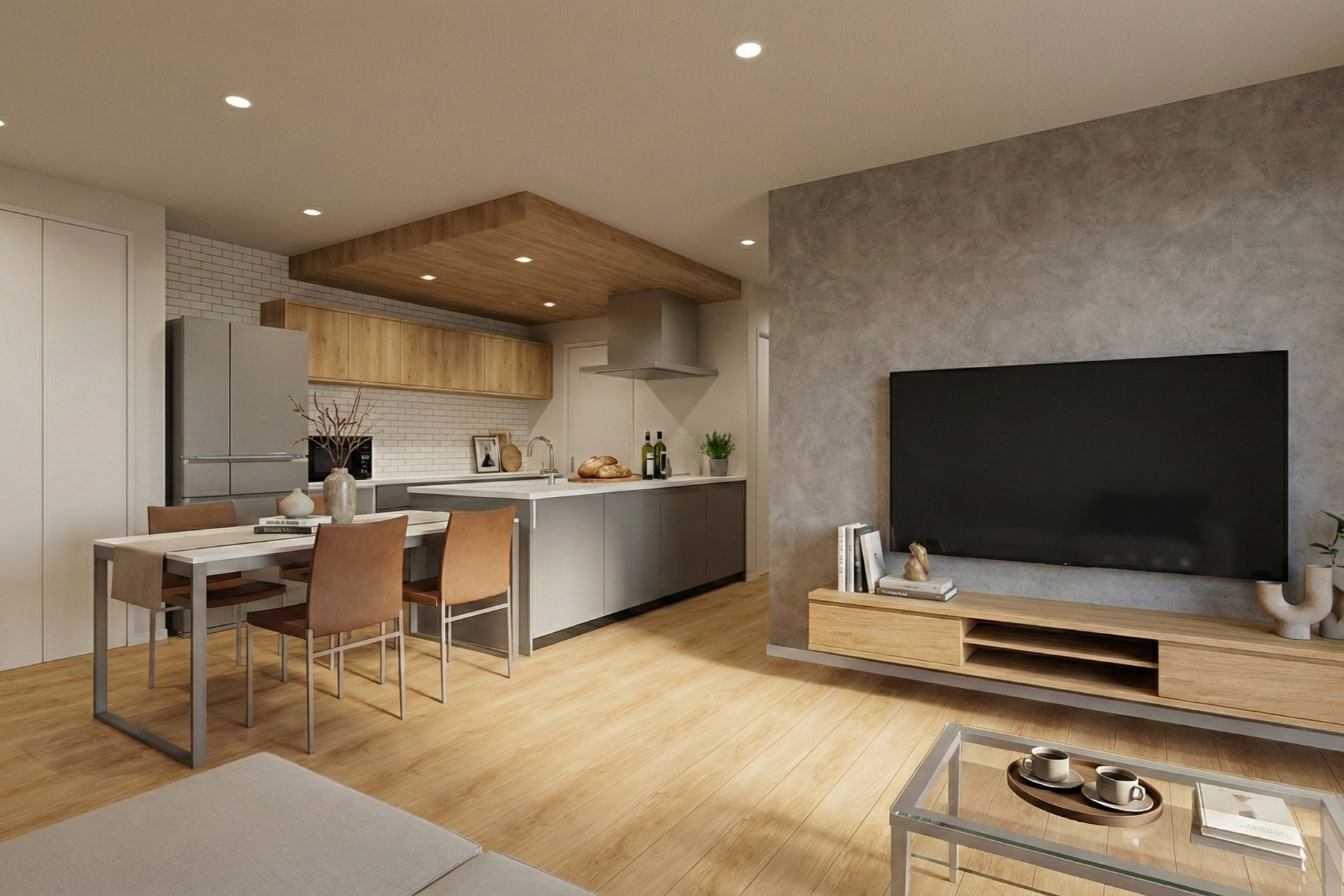 下り天井と幅2700mmの大型カップボードを採用。アクセントクロスで引き締めた空間は、まるでカフェのような佇まいです。