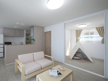 リビングにはおもちゃ遊びもできるキッズスペースを設け、家族の時間をのびのび楽しめます。