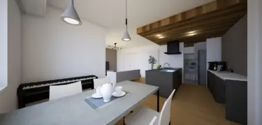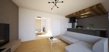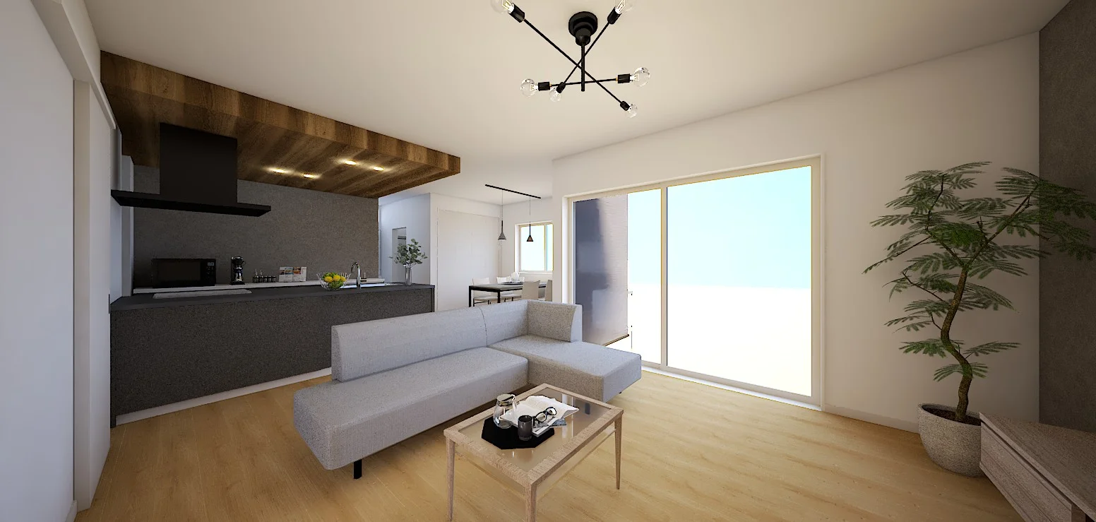 折り下げ天井のオシャレなキッチンのあるシンプルモダンの家