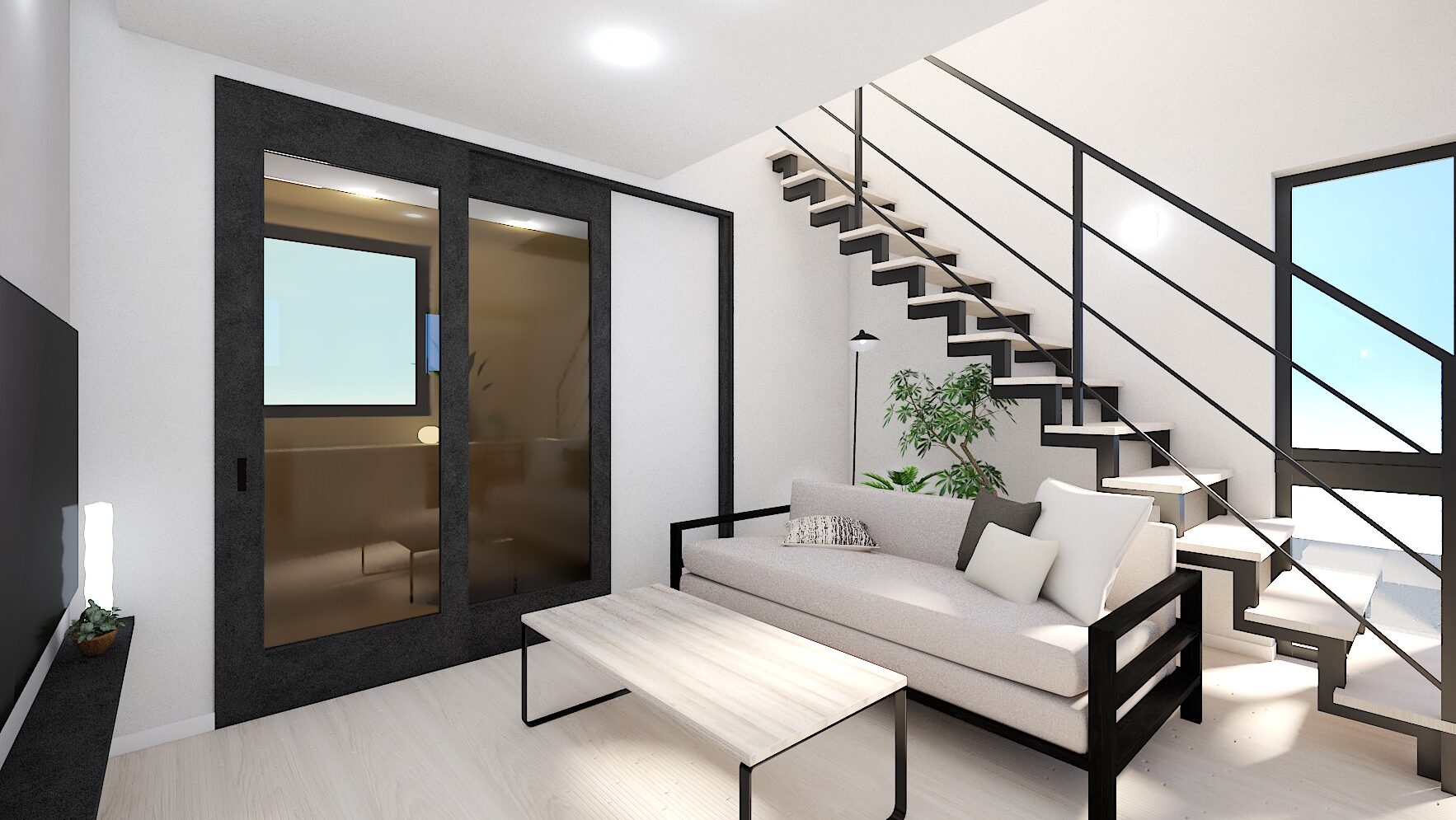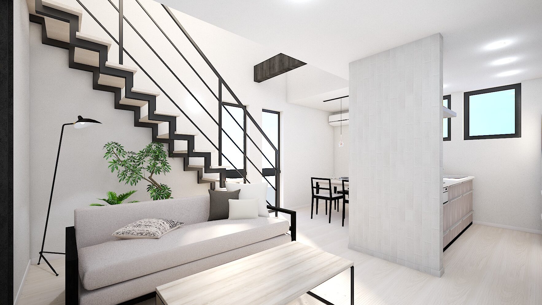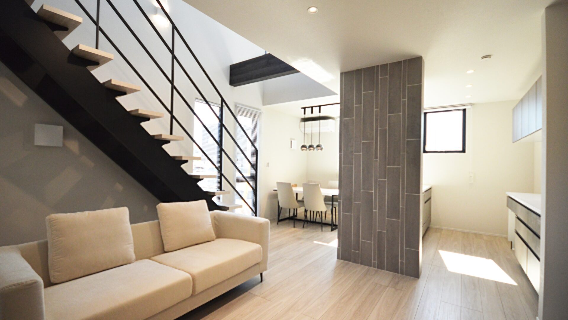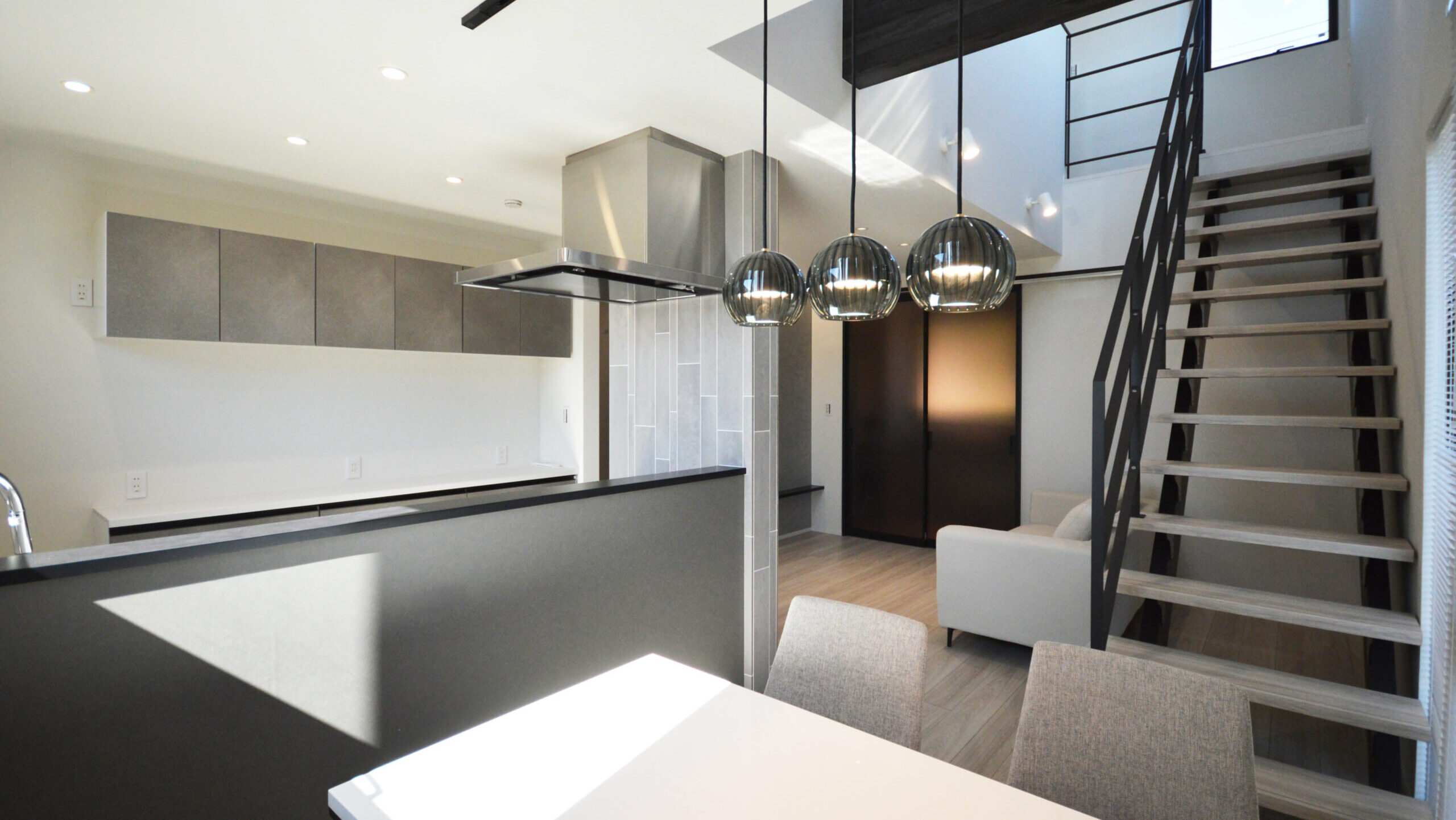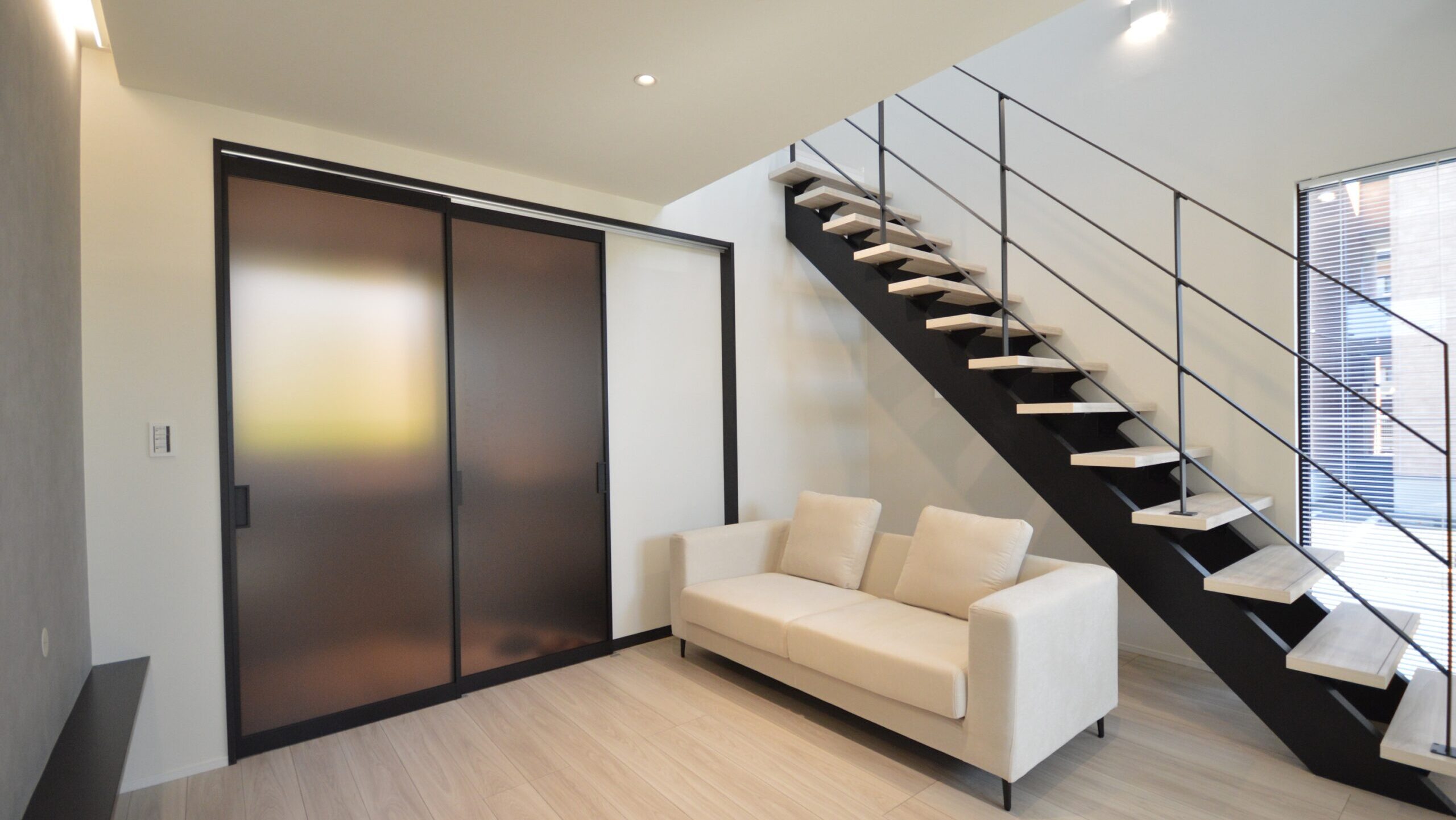 室内は、美しい鉄骨のオープン階段やあらわし梁、吹抜けを組み合わせ、視線が抜ける開放的な空間を演出。