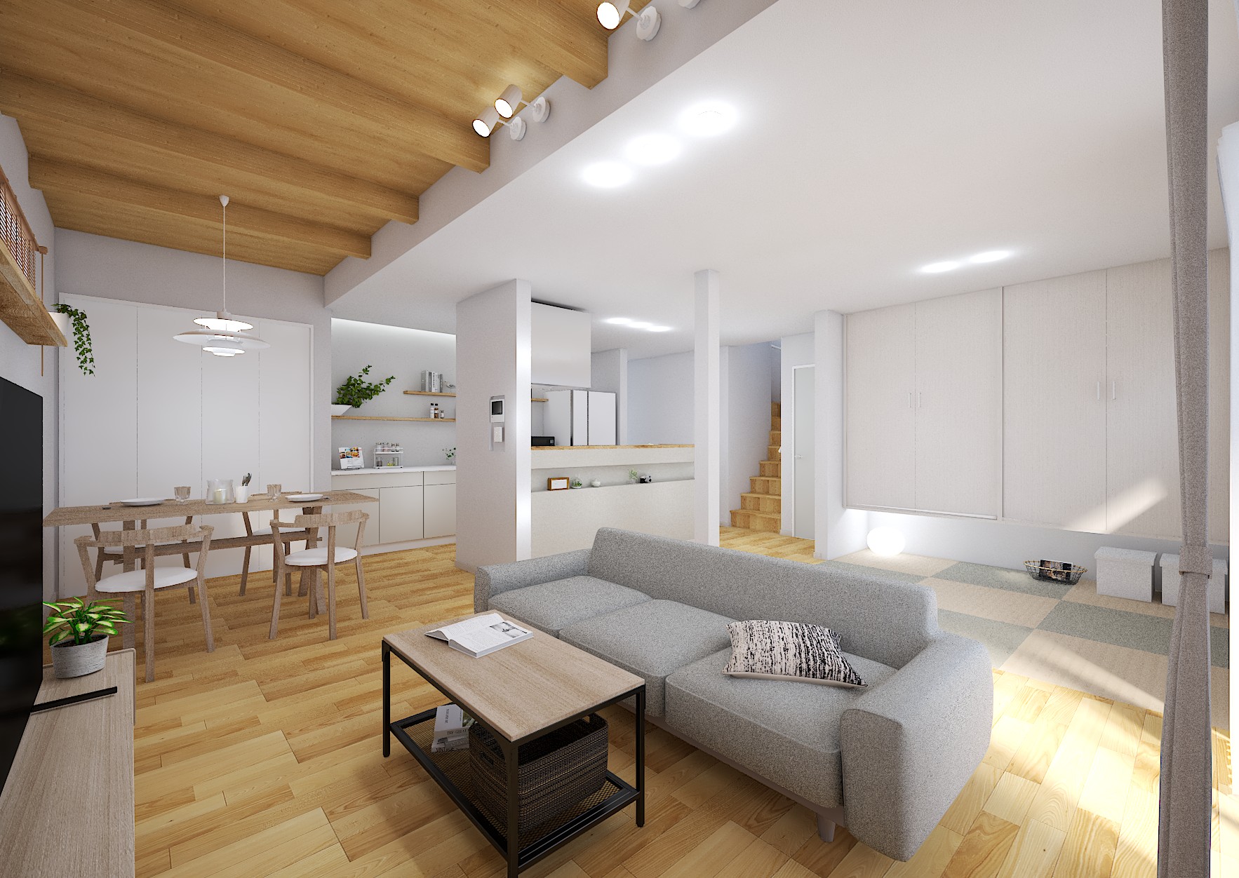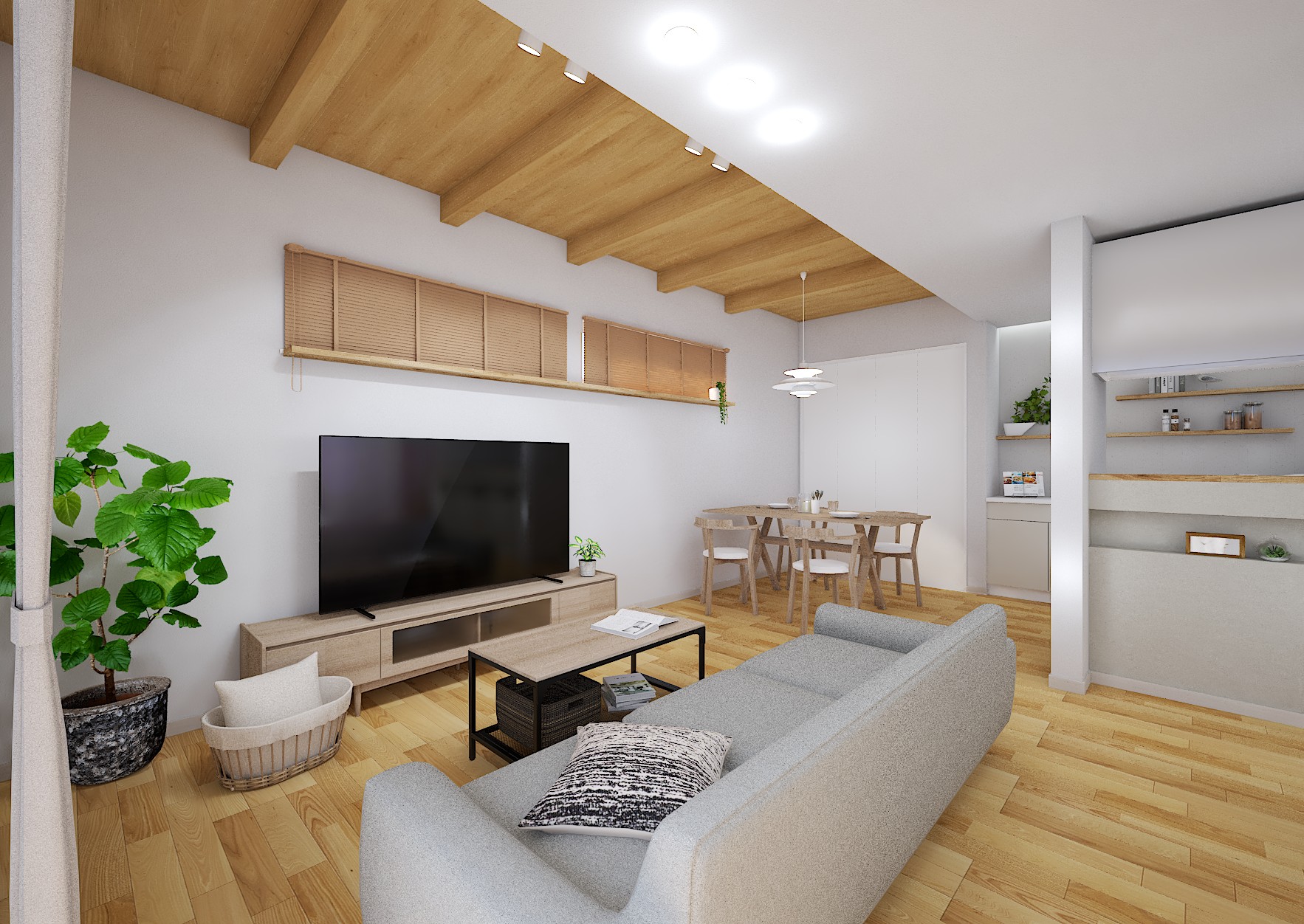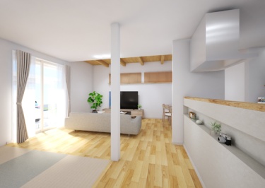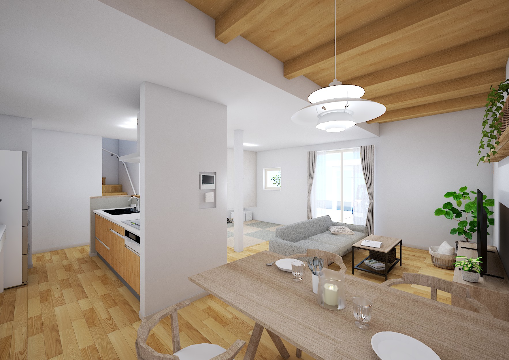 室内は、折上げ天井と木目梁が温かみを演出する広々リビングが見どころ!