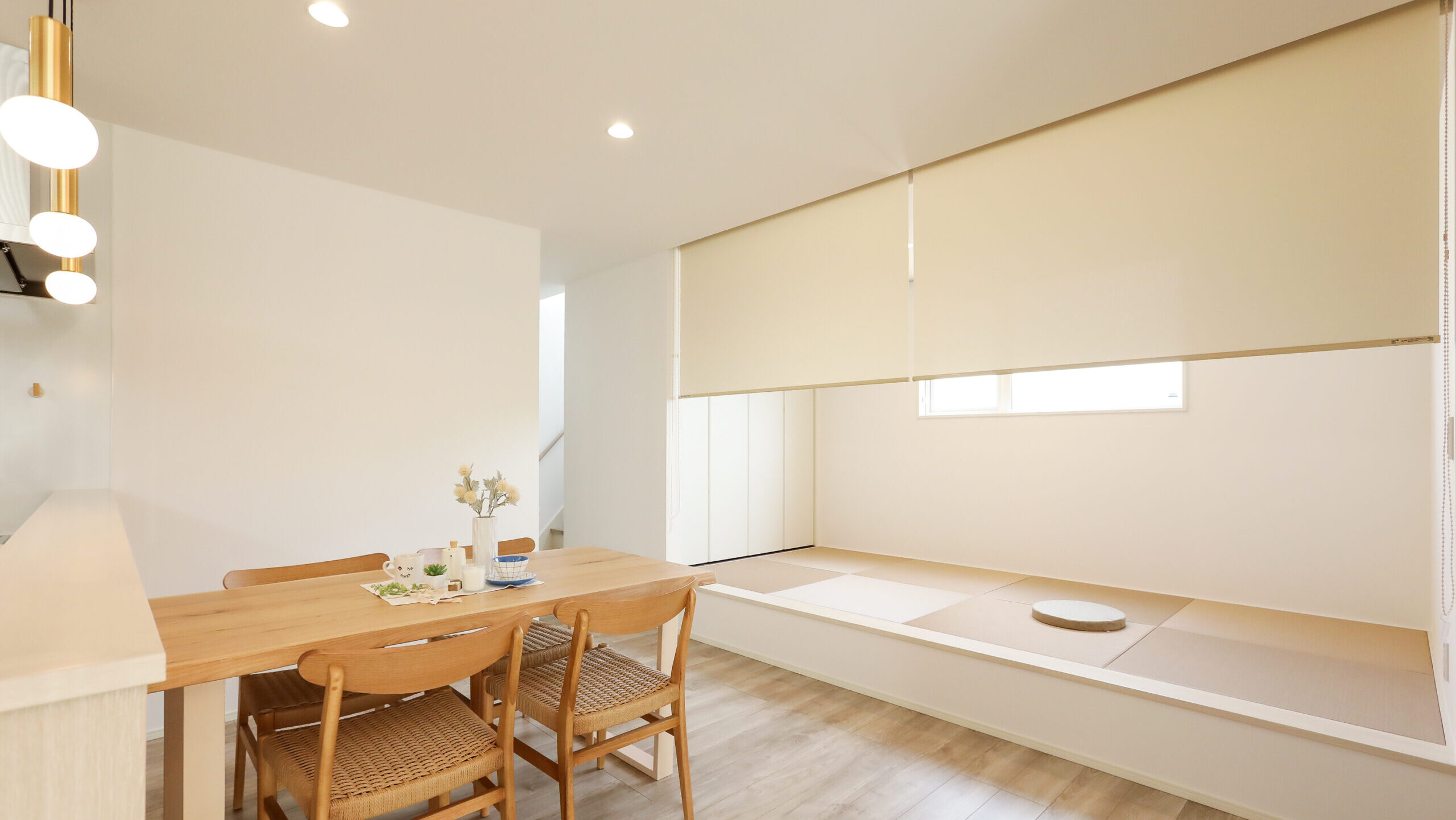 キッチンから視線が届く小上がりスペースは、お子さまの遊び場や来客時のくつろぎの場にぴったり