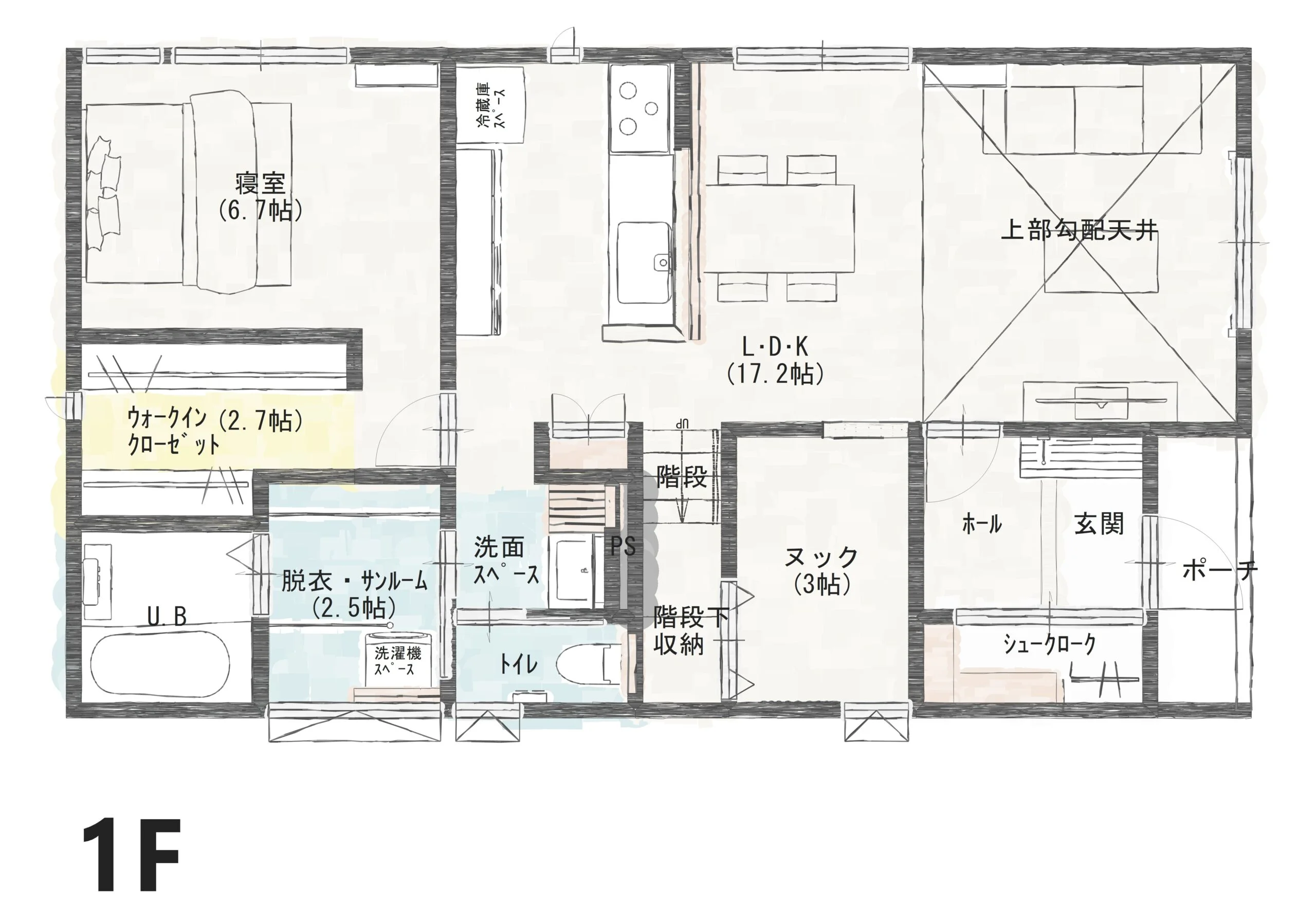 LDK17.2帖の広がりと、開放感あふれる勾配天井