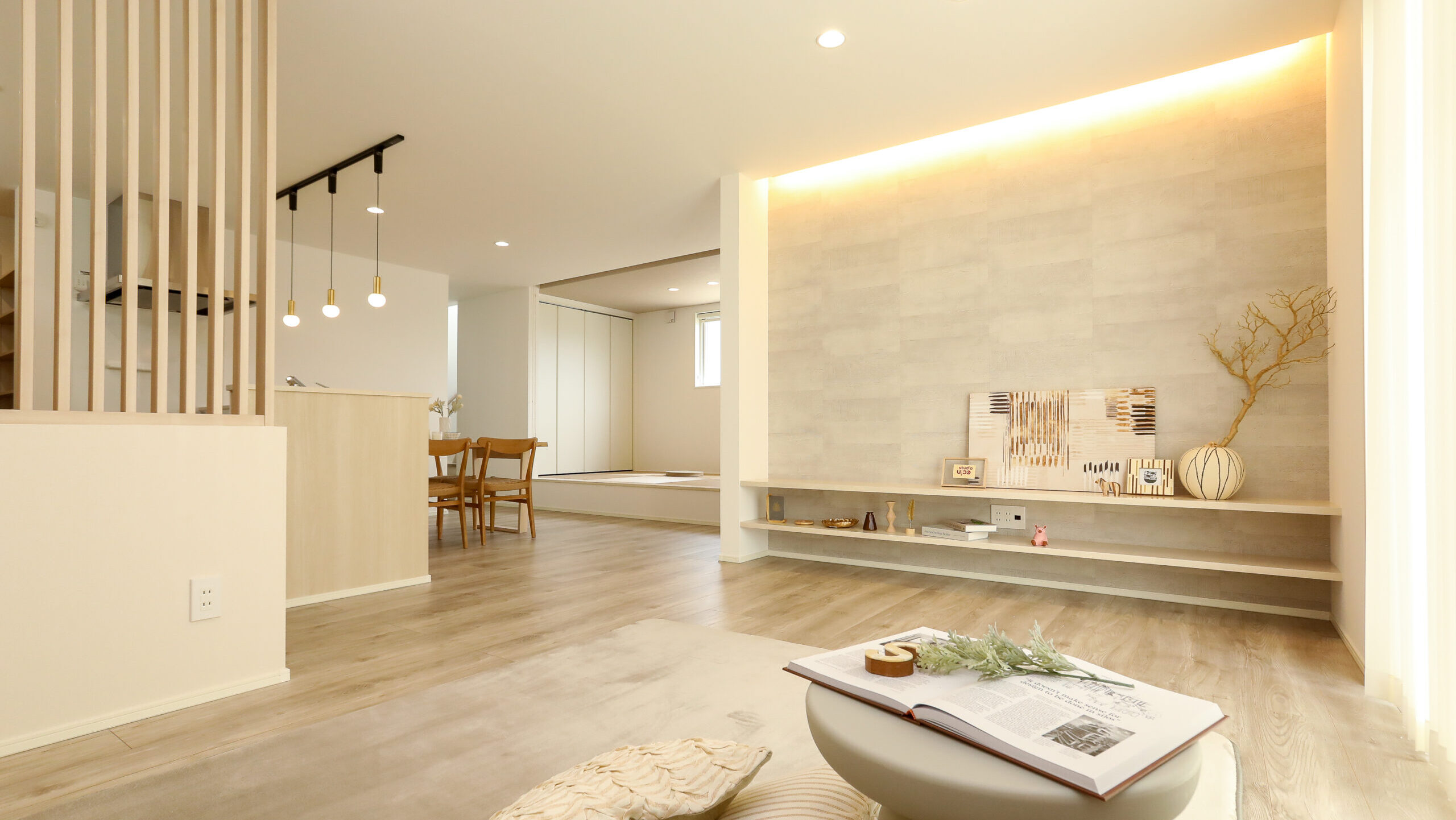 TV背面のアクセントクロス、間接照明が上質な雰囲気を演出します