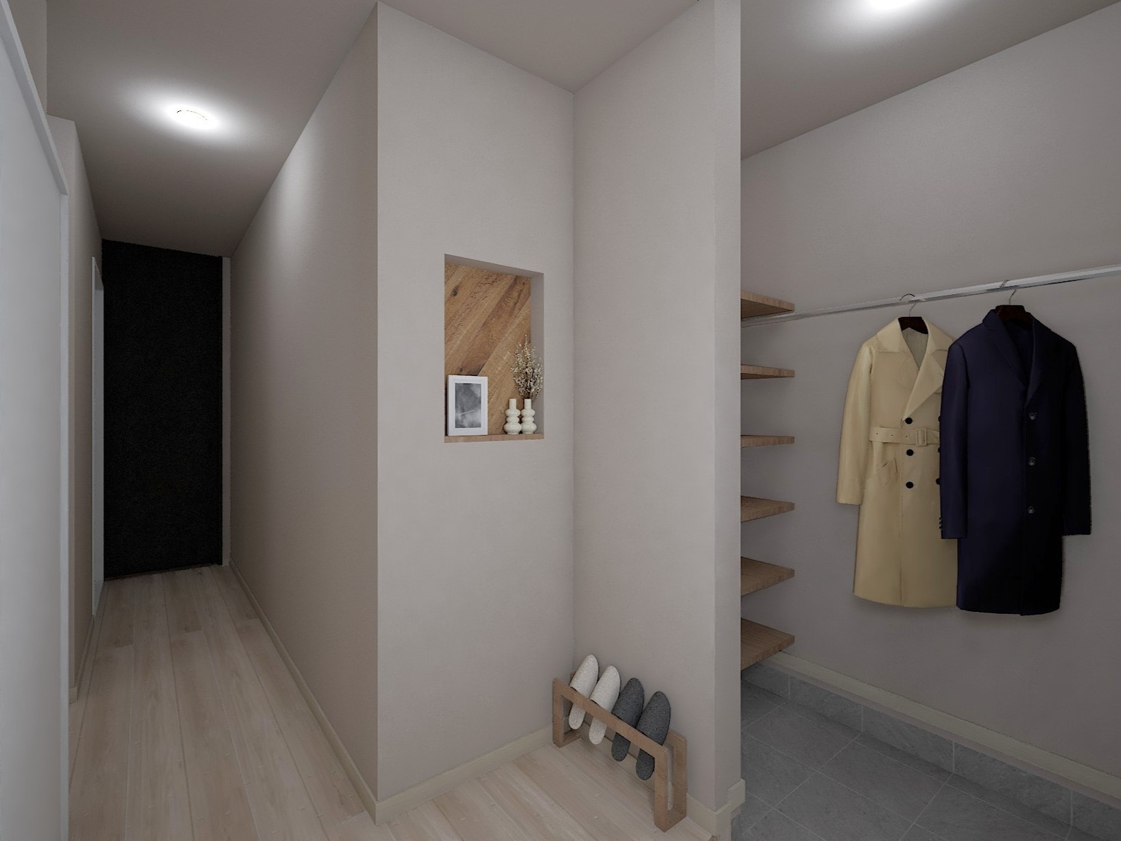 パウダールームには造作ニッチを設け、増えがちな化粧品や小物もすっきり収納!