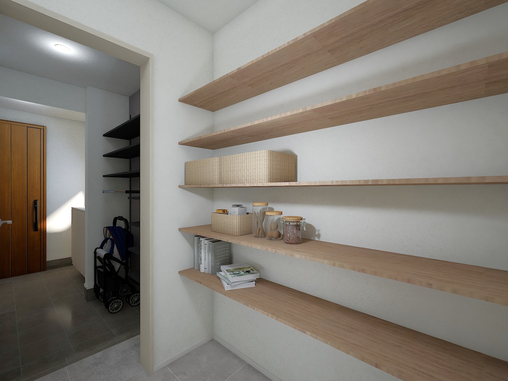 玄関からパントリーへ直結する動線で、買い物帰りの片付けもラクに。