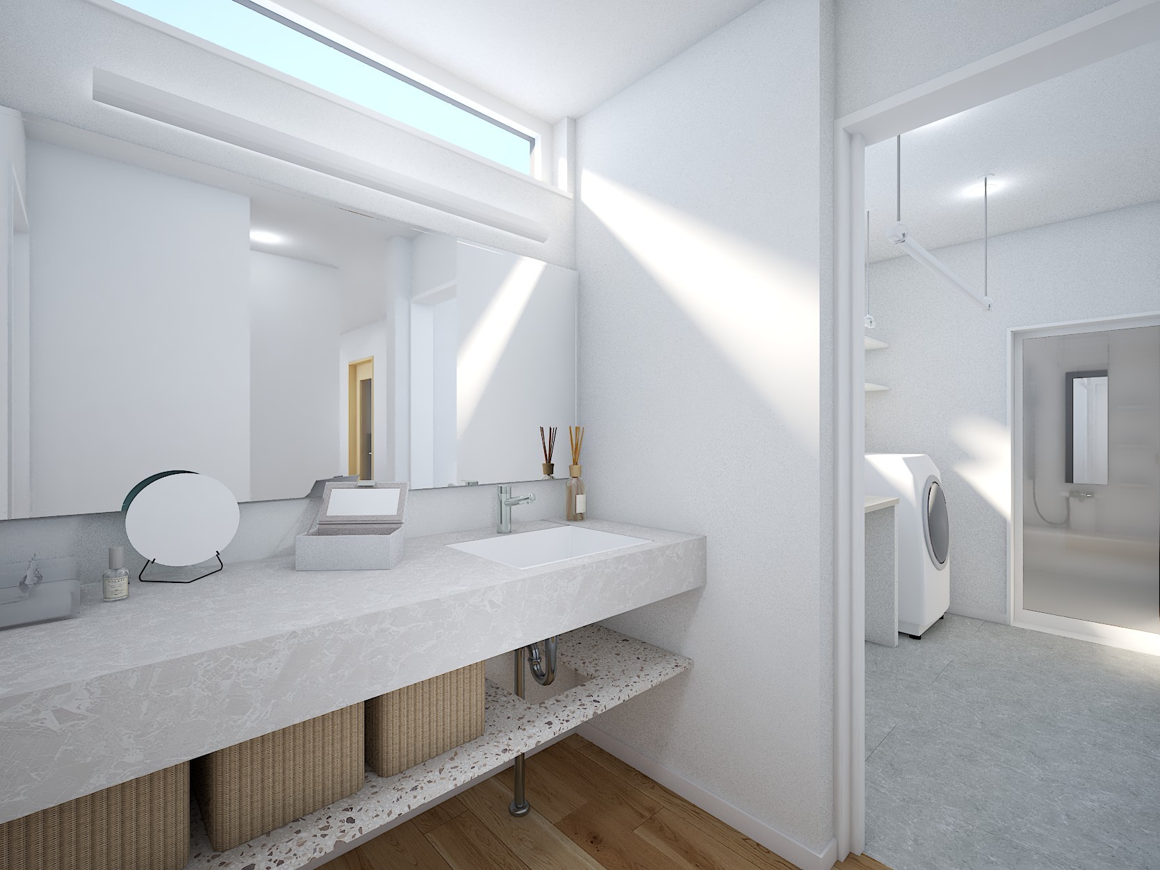 02朝の混雑を解消する「ワイドな造作洗面台」