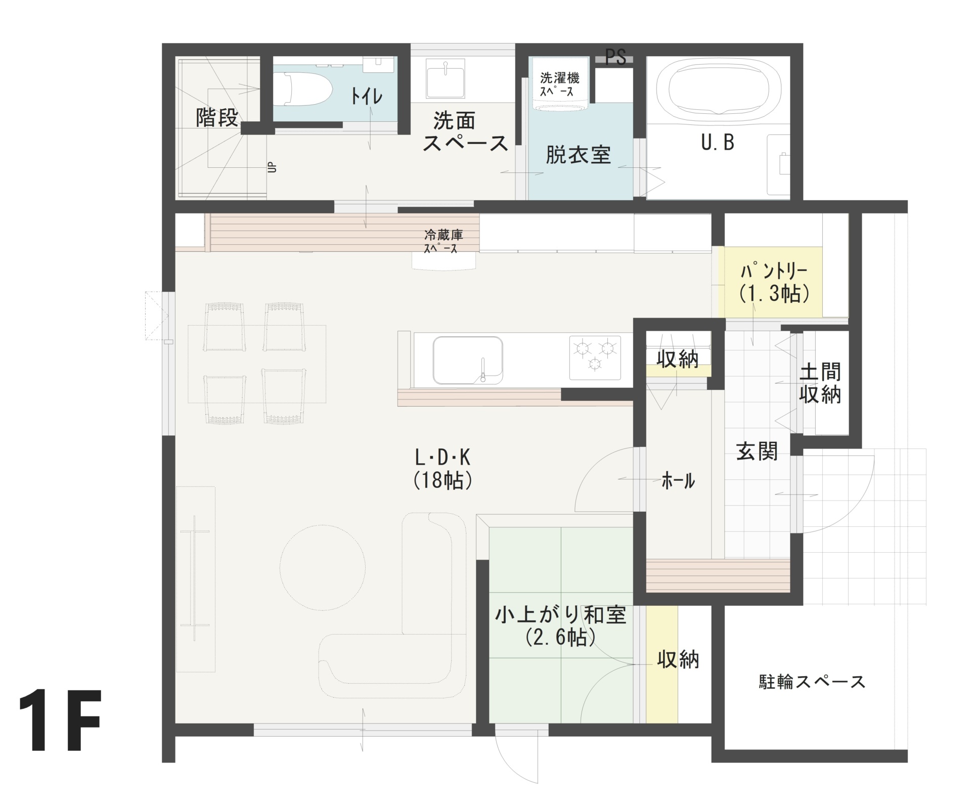 濡れずに使える駐輪場や玄関直結パントリーで便利な動線を実現。LDKや小上がり和室、大容量収納が充実し、将来間仕切りできる子供室や広いインナーバルコニーなど、快適に暮らせる工夫が満載の住まいです。