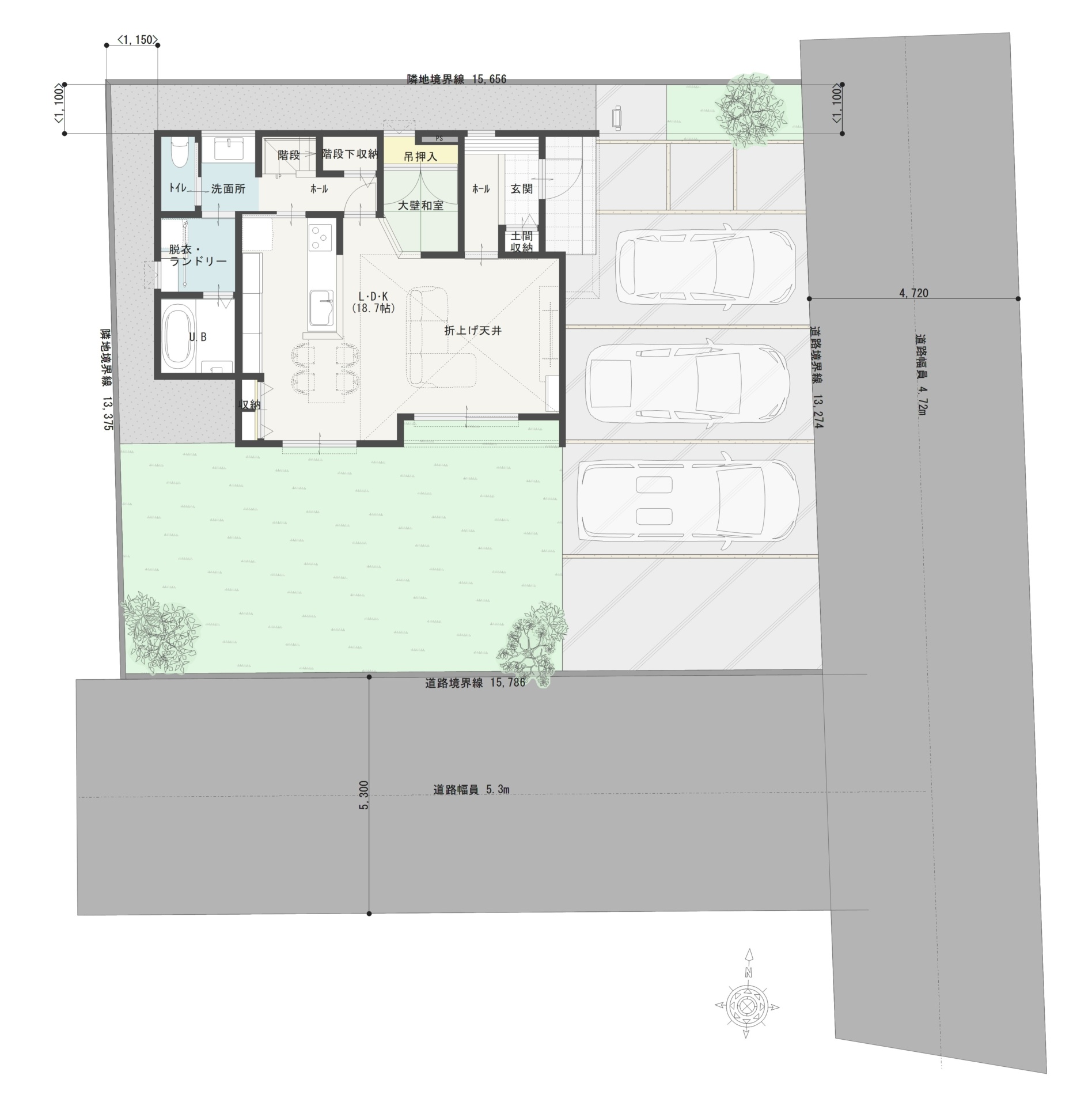 折上げ天井が広々とした18.7帖のLDKは、家事動線の良い横並びキッチンが魅力。充実の収納と室内干しスペースで家中スッキリ整います。4台駐車可能な広い敷地と、造作洗面台など拘りの詰まった一棟です。