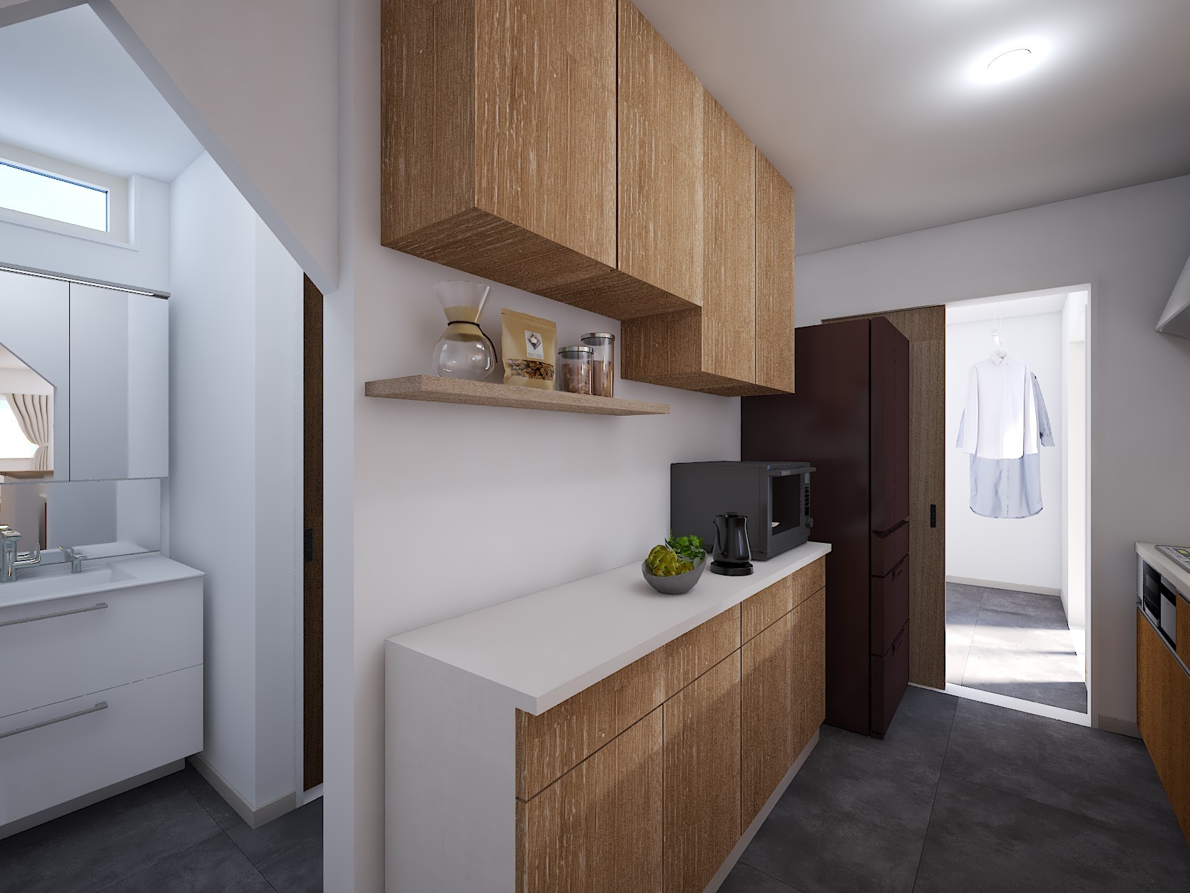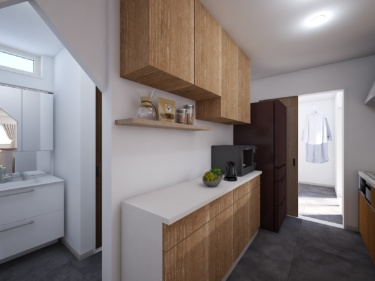 ・脱衣室⇒キッチンに隣接した日当たりのよい広々サンルーム⇒ファミリークローゼットと家事効率を考慮したレイアウト。