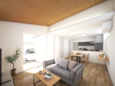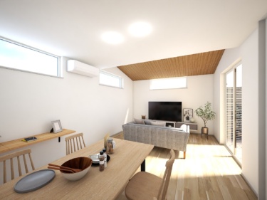 『木目の勾配天井が織りなす、開放感あふれる住まい』