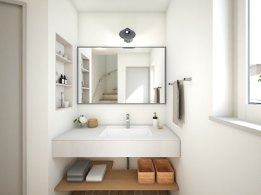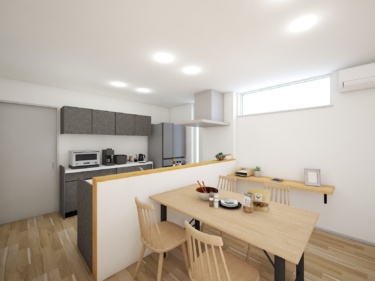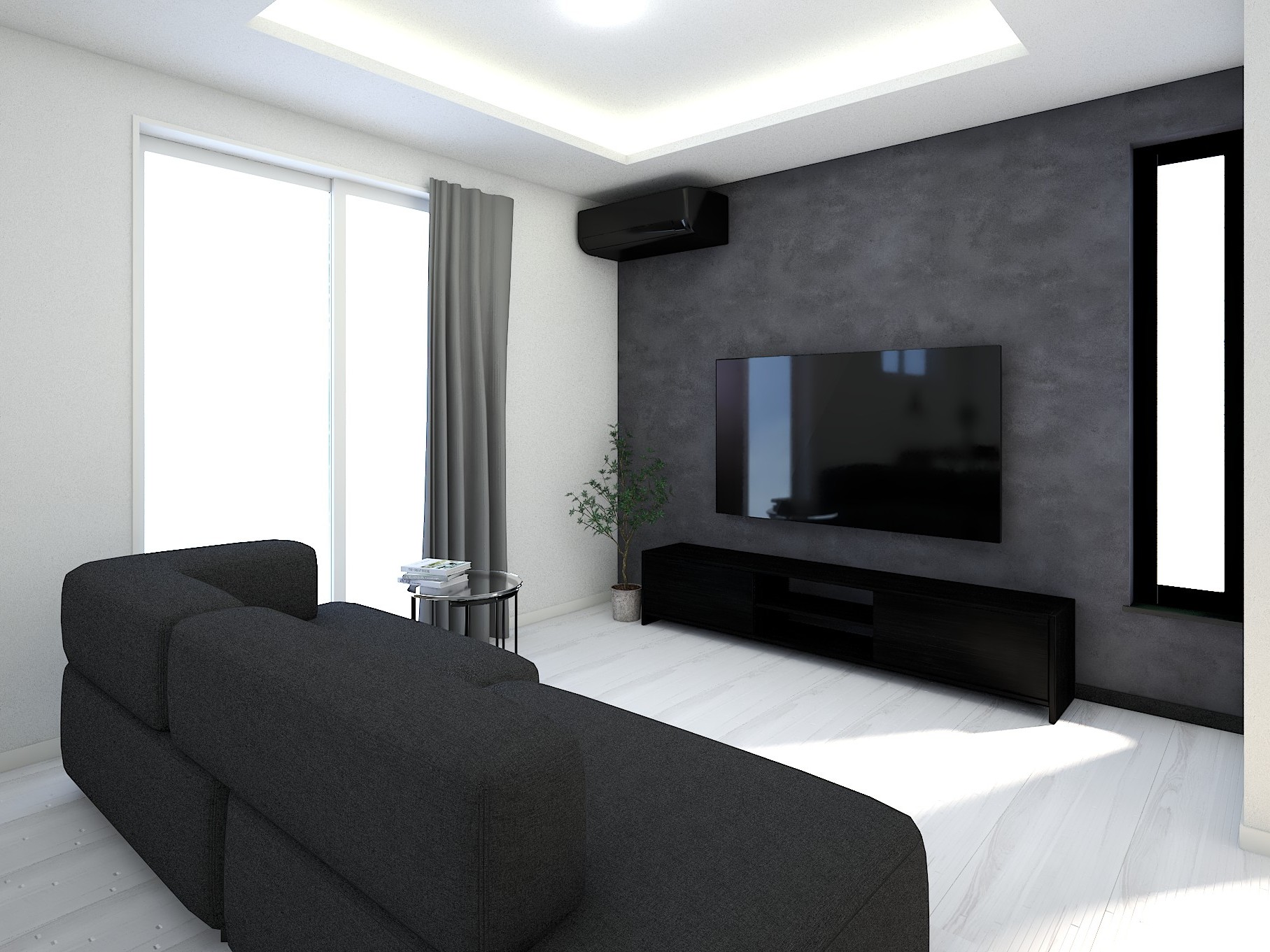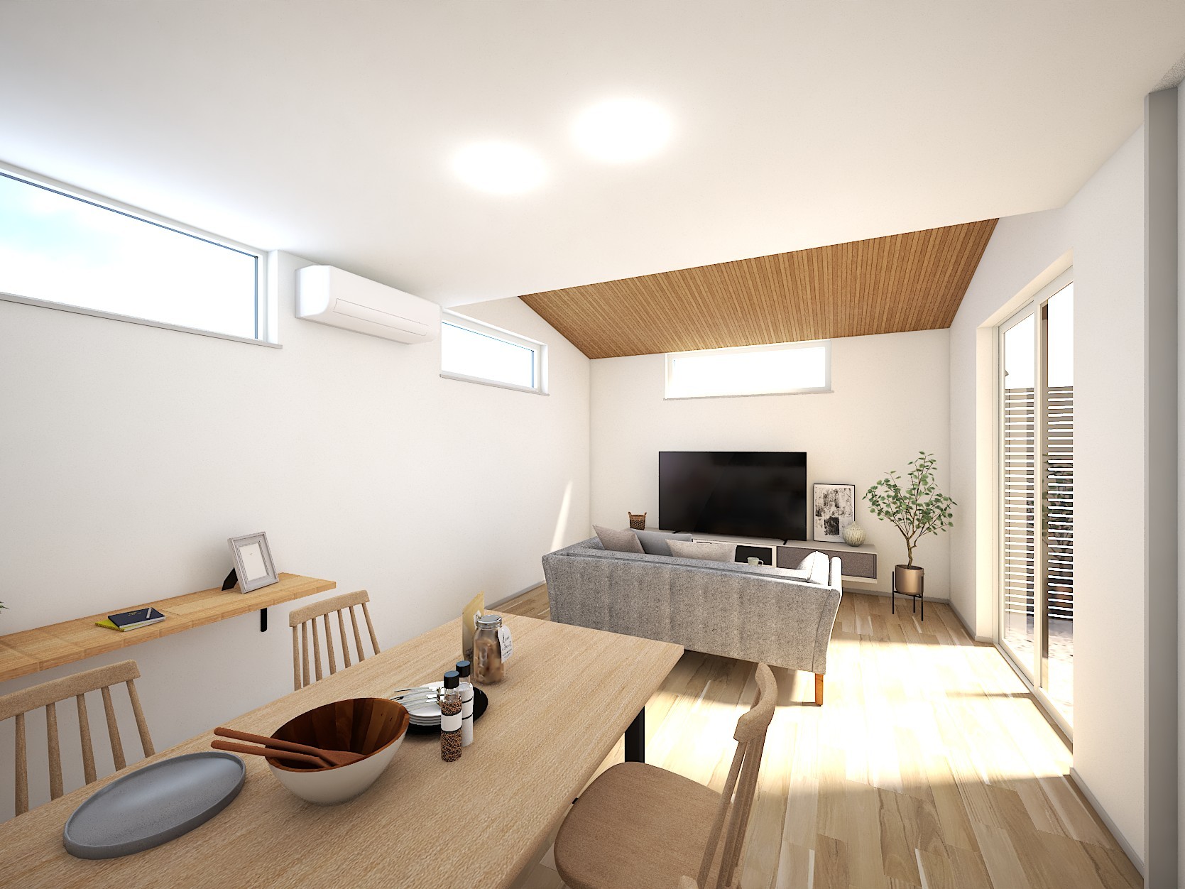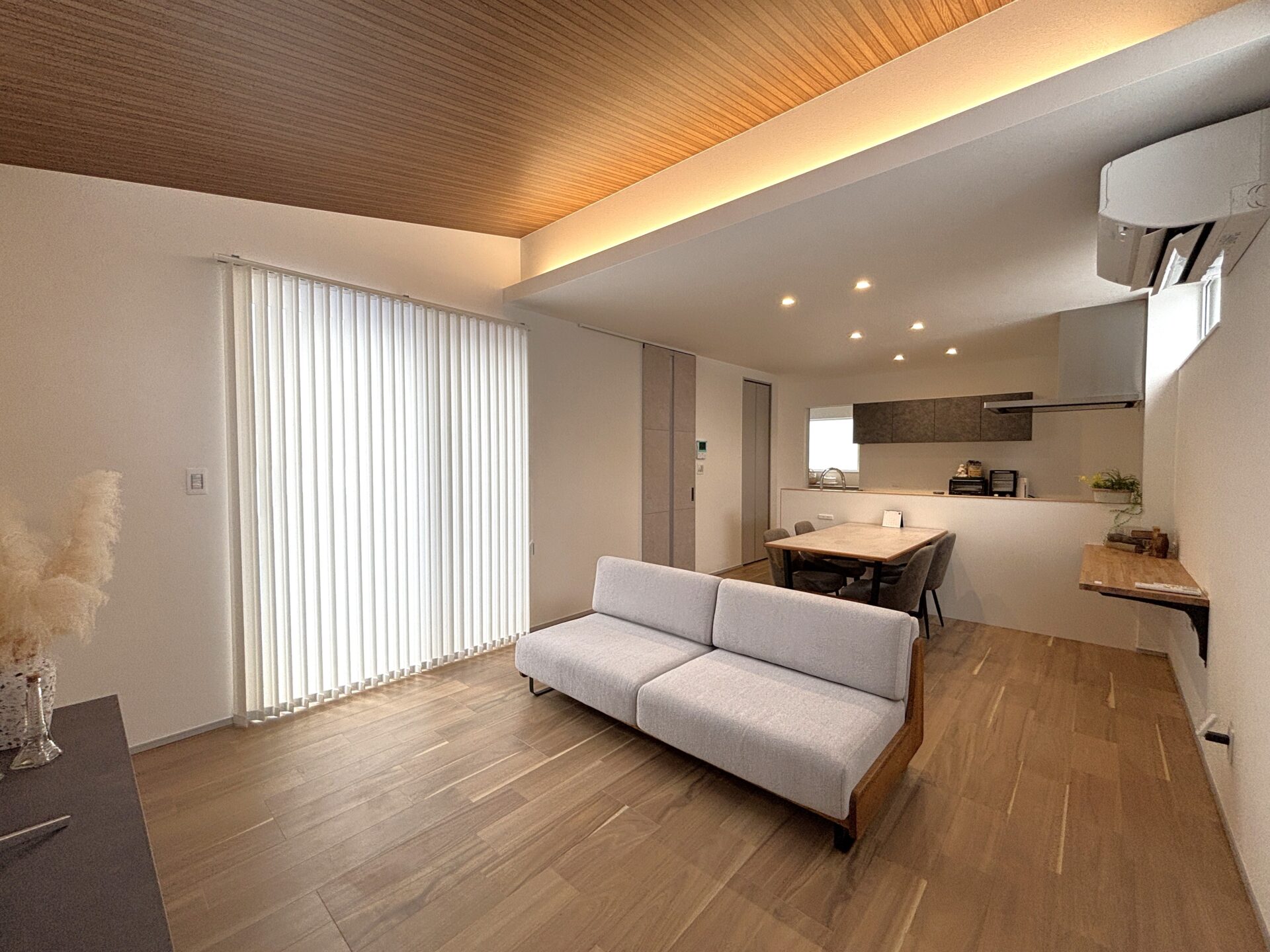 コンパクトながら、数値以上の広さを感じさせる工夫が凝らされた一棟!リビングの勾配天井には美しい木目柄を採用。高さが生み出す圧倒的な開放感と、計算された間接照明の陰影が、ホテルライクな空間を演出します。