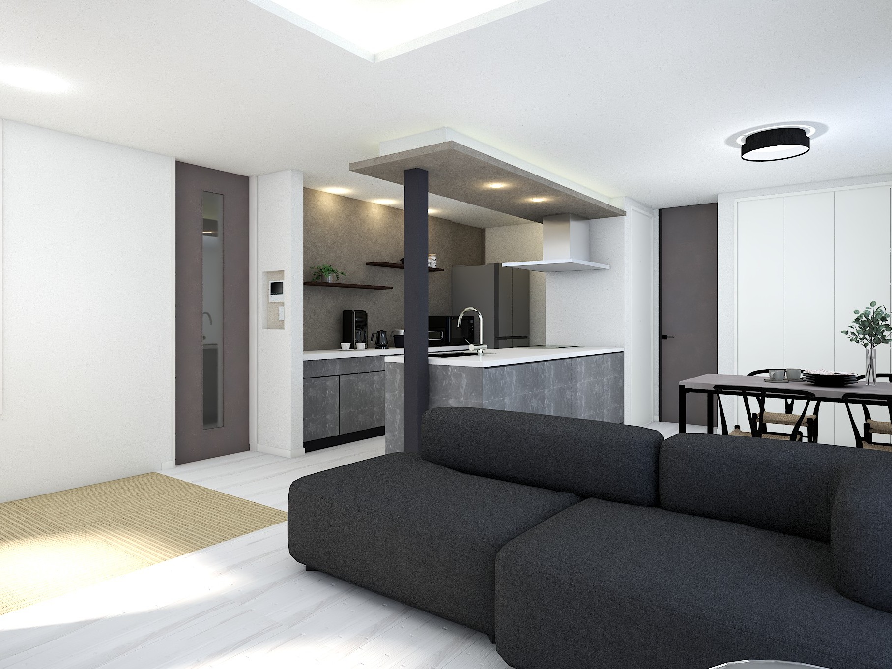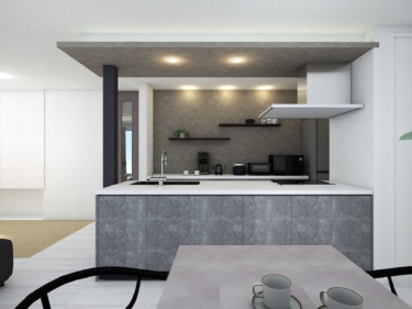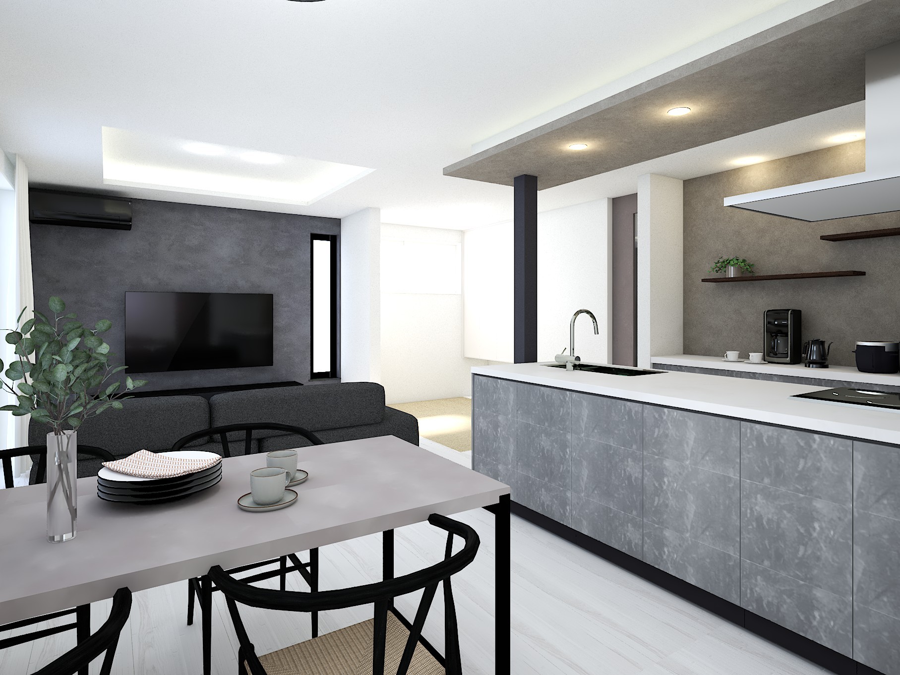 キッチン中心の回遊動線とホテルライクな高級感が魅力の住まい。上下の折り上げ天井と間接照明がLDKに奥行きを演出。ペニンシュラキッチンや造作洗面台など人気設備を凝縮し、収納力と美しさを両立した理想のお住まいです。