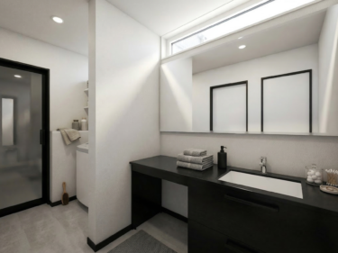 また壁掛けTVや造作ニッチ、二人並べるワイドな洗面台などオリジナルアイディアが詰まっています。