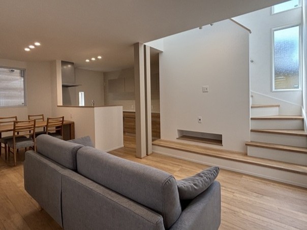 階段の壁を有効活用した壁掛けTVスペースと、便利なニッチ収納でデザイン性と機能性を両立。吹き抜けのFIX窓から入る自然光が明るい空間を演出します。隣接する小上がりを含め17.5帖の広々LDKは、遊び場や家事にも最適です。