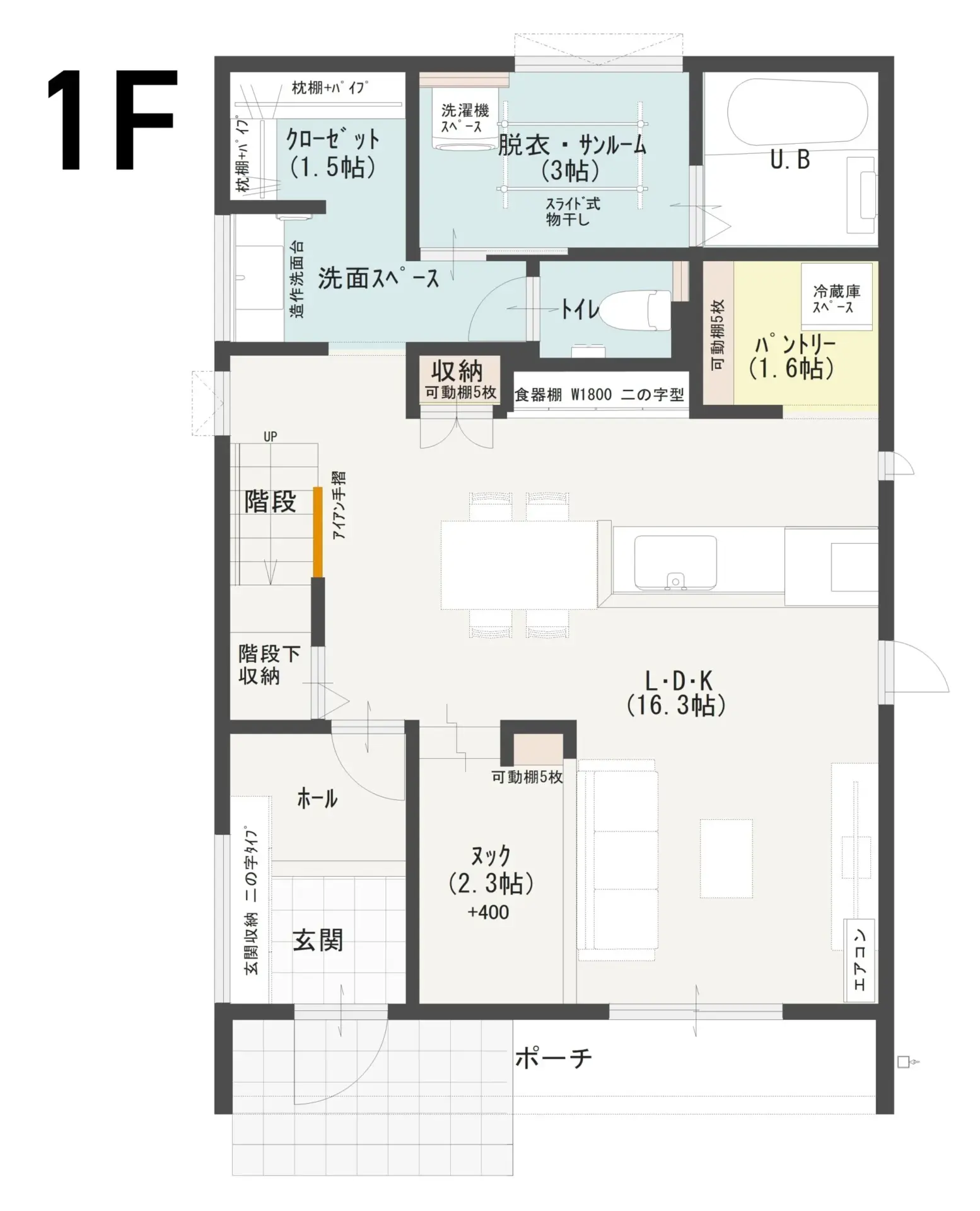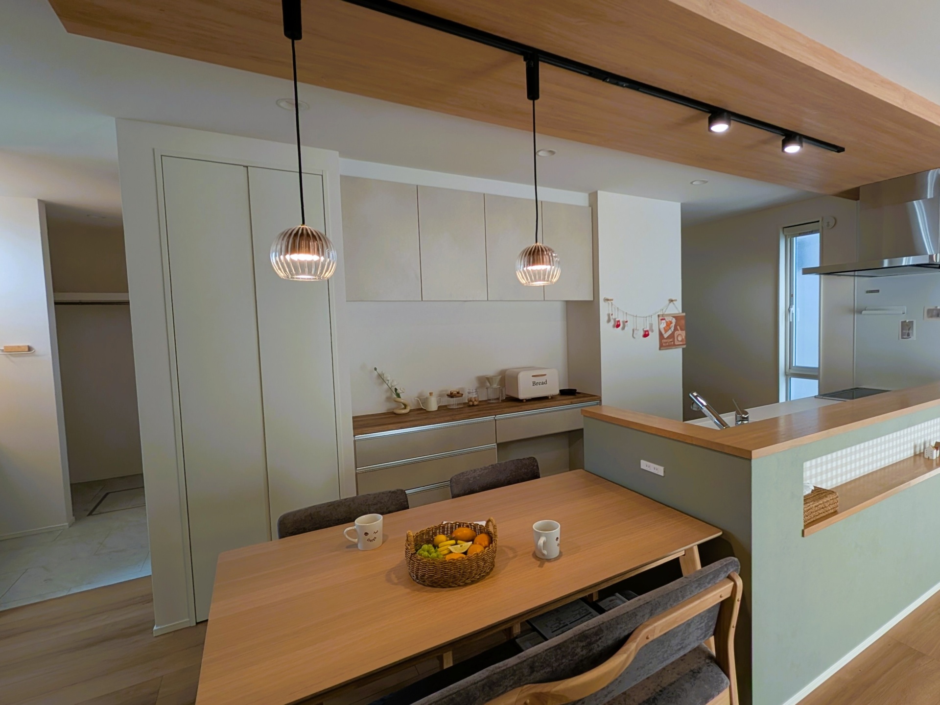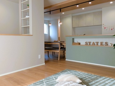 キッチンから家全体と「ヌック」を見渡せるLDKは、家事をしながらお子様を見守れる安心設計♩大容量パントリーや各階の納戸で収納力も抜群です。脱衣室には可動式物干しを備え、効率的な家事動線も実現しました