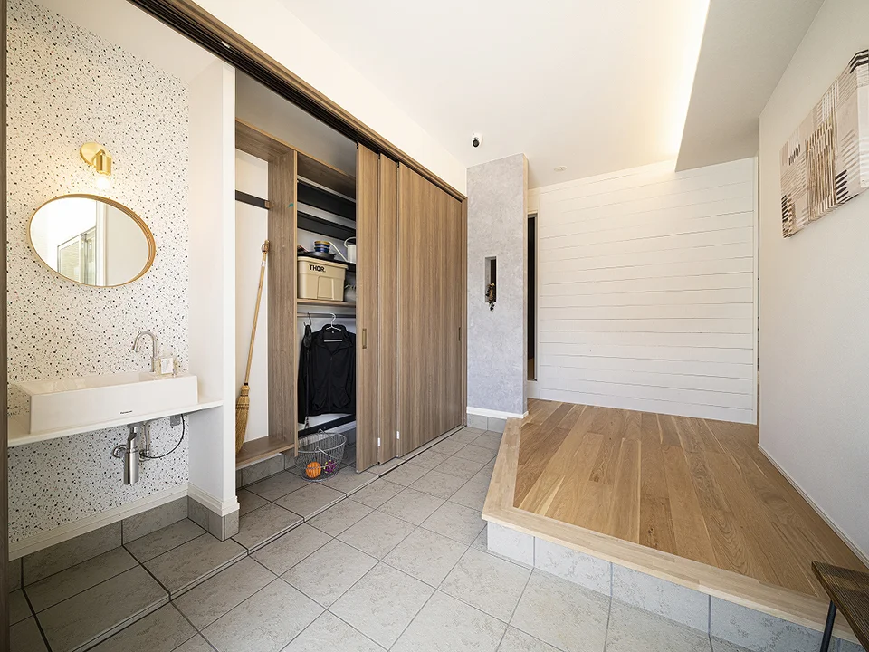 帰宅後にすぐ手を洗えるおしゃれな手洗いとクローク付きの開放的な玄関