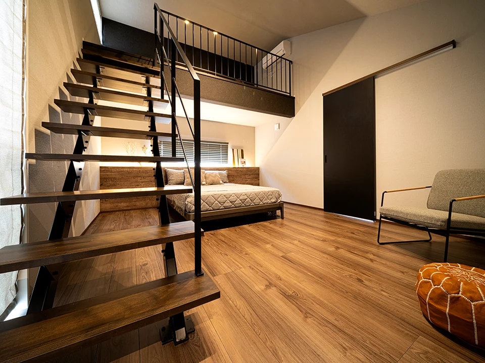 ロフト付きのシックな寝室。ロフトは収納スペースや隠れ家的な使い方など思いのまま。