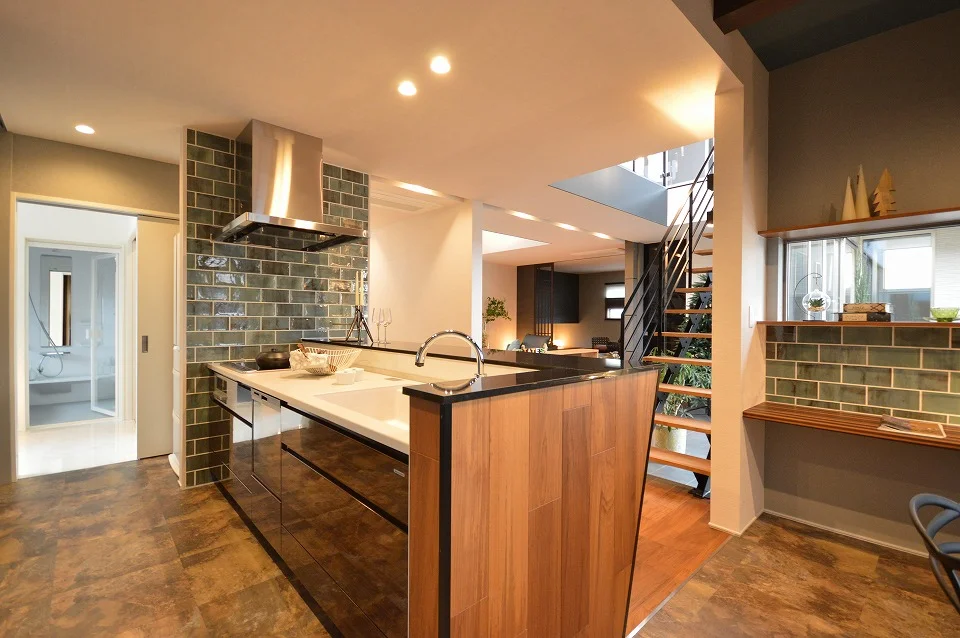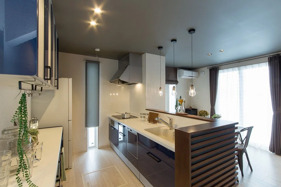 シックながらホワイトで明るさを確保したキッチン(B棟)