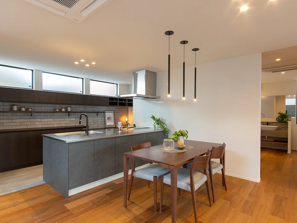 水回りの導線をまとめた配置、吹き抜けを活用したリビング・ダイニングなど、見どころが盛り沢山のモデルハウスです。