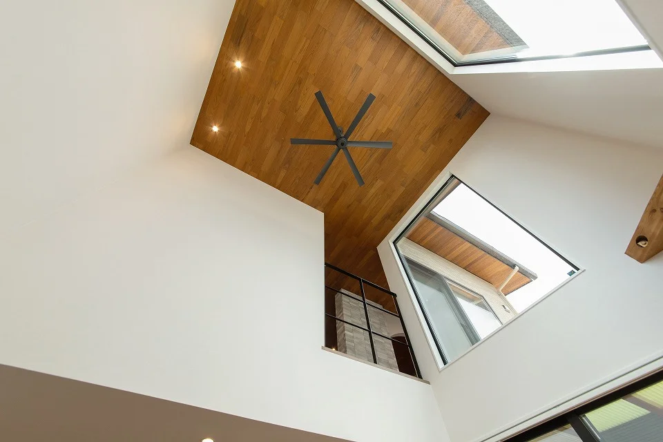吹き抜けには大型のFIX窓を採用し、外光をまとめて取り込む