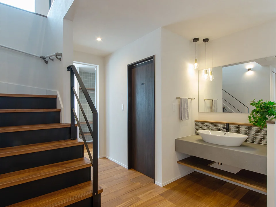 階段下ホールにお手洗いや洗面台を設置