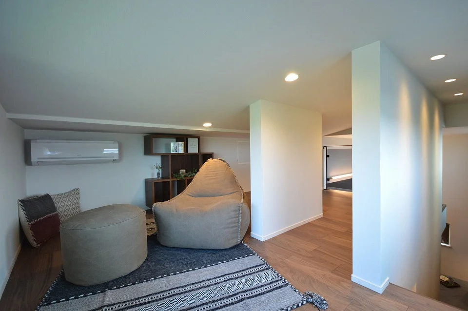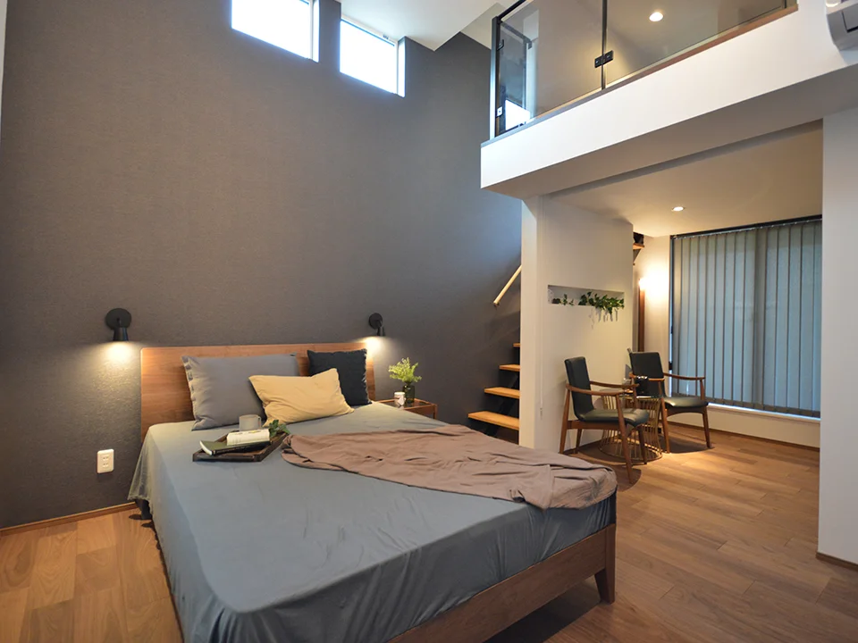 お洒落なロフト付きの寝室、ロフトはクッションなどを置いてゆったりくつろげる空間にも最適