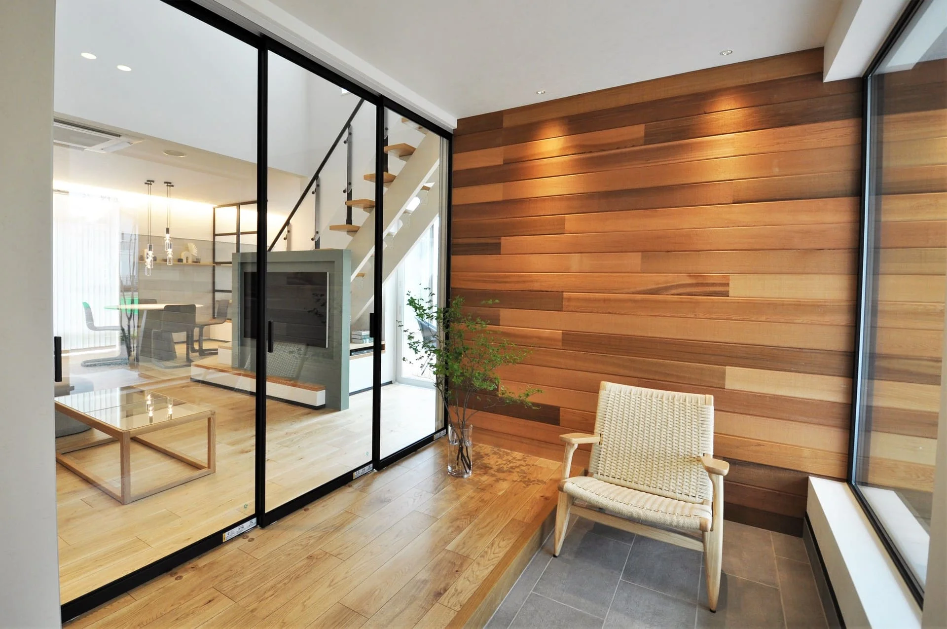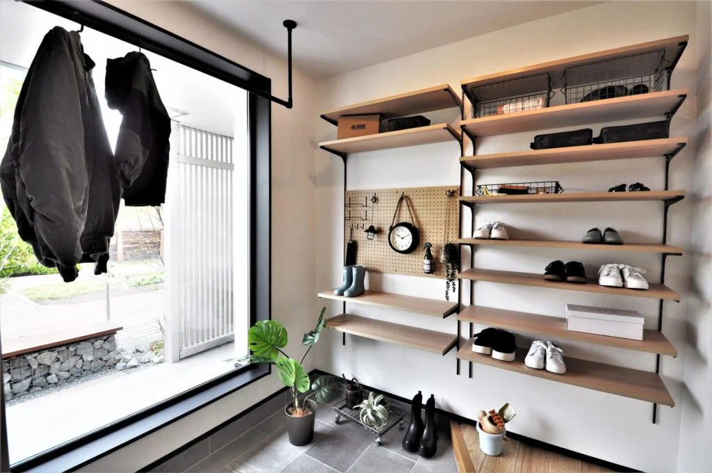暗くなりがちなシューズクロークにFIX窓を設置し、明るさを確保