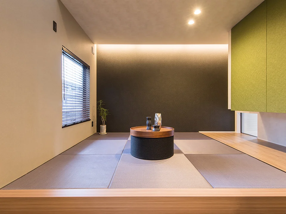 隣接する和室(4.5帖)は、客間やお子様のお昼寝スペースとして活用でき、扉を閉めてプライベート空間も確保可能。サンルームと洗面・脱衣室が近接しているため、洗濯の動線がスムーズ。大きなインナーガレージも魅力の一つです。