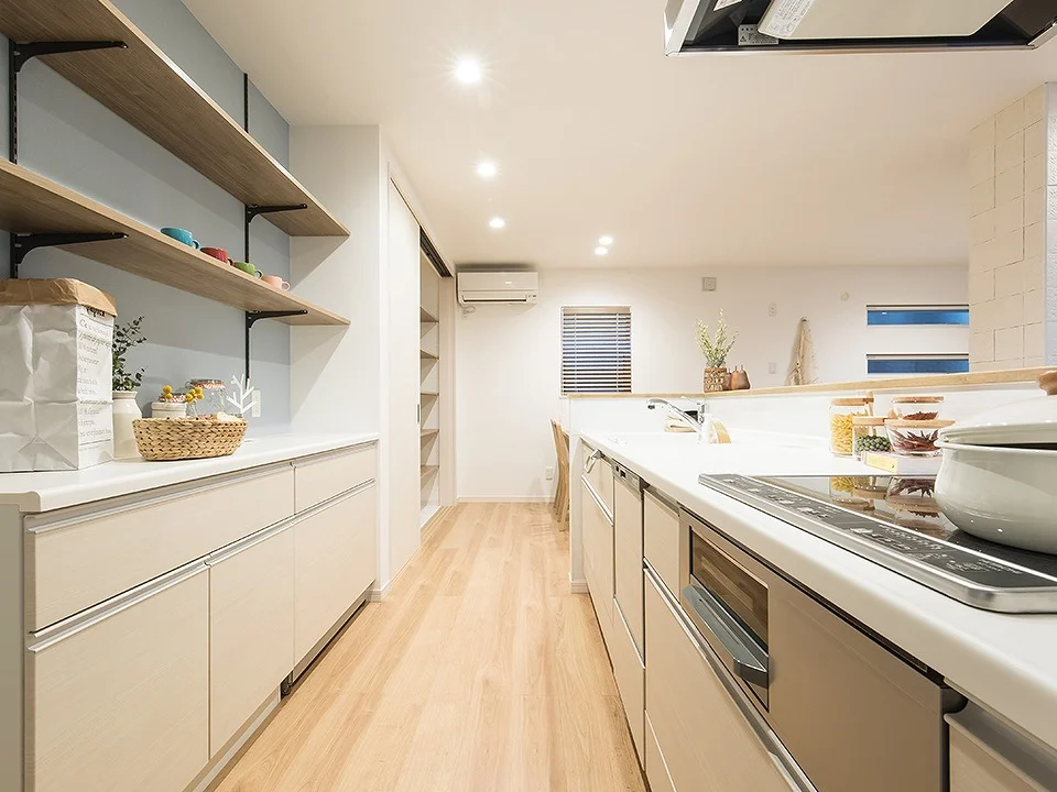 家事の負担を軽減し、ゆとりある時間を生み出す間取りです。キッチンは、収納スペースが充実しており、調理器具や食材をスッキリと整理できます。