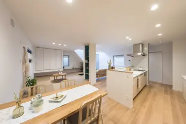 1階は、広々としたリビング・ダイニング・キッチン(16.7帖)が特徴で、家族全員が集まりやすい空間です。キッチンは収納スペースが豊富で、整理がしやすく、リビング全体を見渡せる配置です。