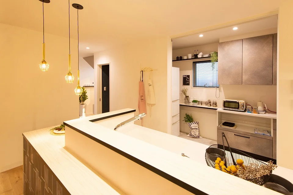 21.7帖の吹き抜けのリビングとダイニング、キッチンにはパントリーを備え、水回りは一直線の導線でまとめてスッキリ!