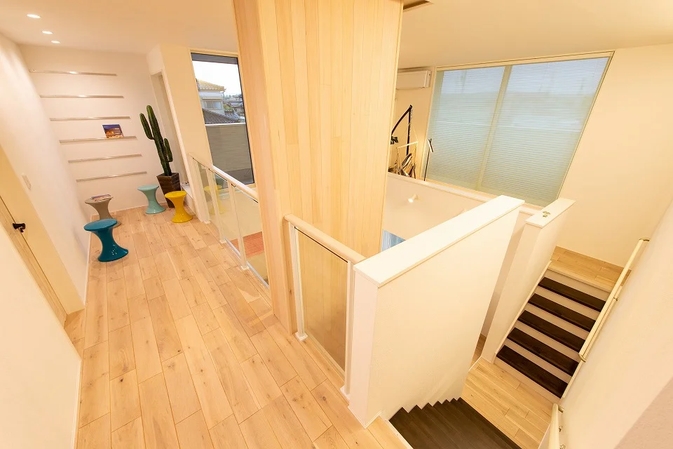 ニ階へ上がる特徴的な階段は、スキップフロアを中心に階段が別れており目的の進路によって導線を分けることが可能に。