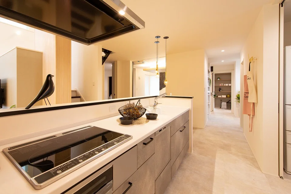 21.7帖の吹き抜けのリビングとダイニング、キッチンにはパントリーを備え、水回りは一直線の導線でまとめてスッキリ!