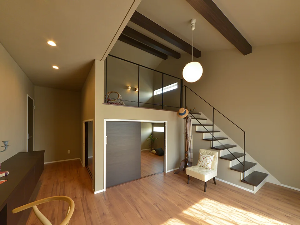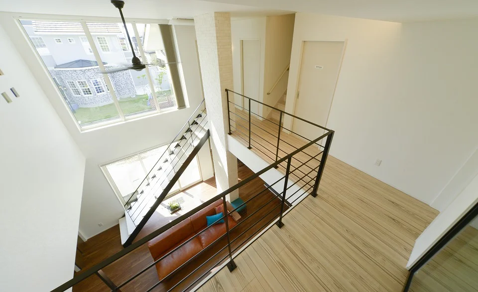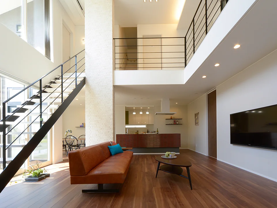この展示場では、家族全員が集まり、楽しい時間を共有できるように、リビングスペースが広く取られています。特に吹き抜け天井のリビングは、家族が自然と集まる開放感のある場所。