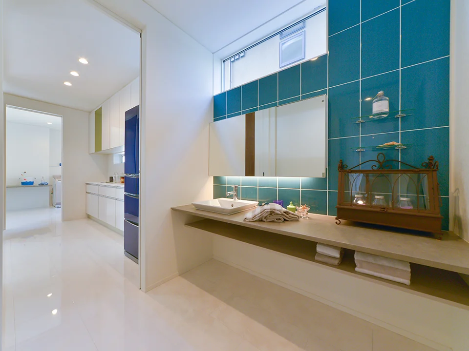 オシャレなタイル張りの壁に造作の洗面ボウルを取り入れた家事室です。デザインだけでなく家事をスムーズにする一直線の動線を設けています。