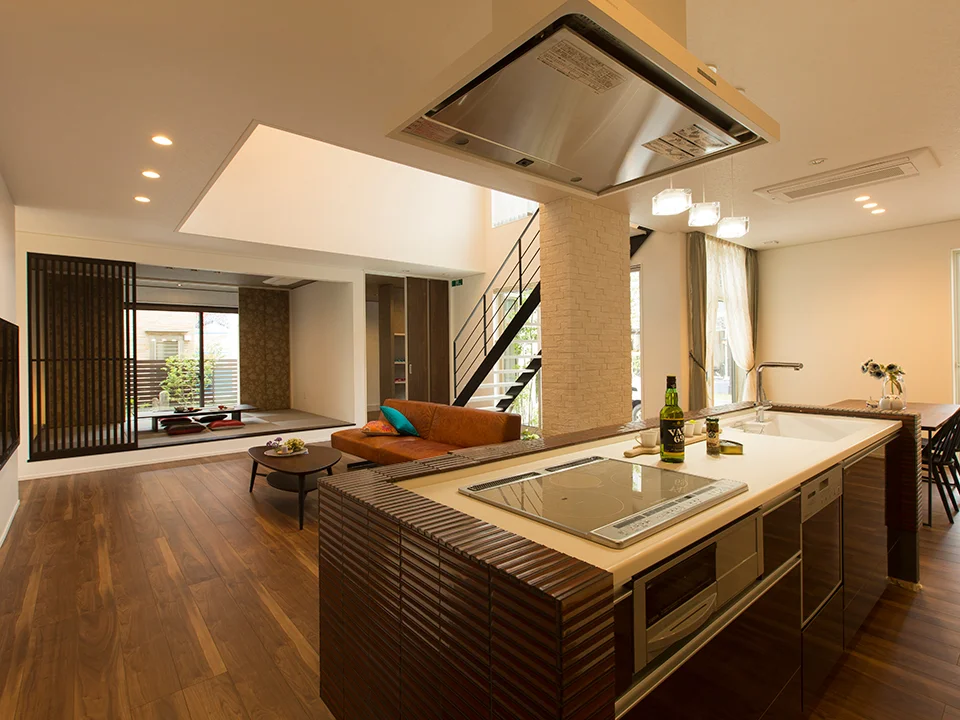 キッチンは、料理しながらリビングやダイニングにいる家族の様子を見渡せるオープンタイプ。子どもたちの勉強や遊びを見守りながら、家事をこなすことができるレイアウトです。