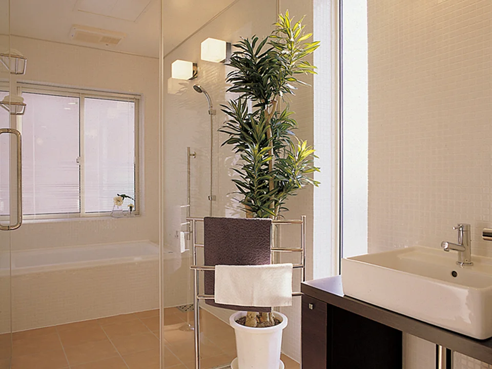 一日の疲れを癒やす空間である浴室は、リビングの延長と考えます。落ち着いた雰囲気を大事にするため、タイルにこだわりました。