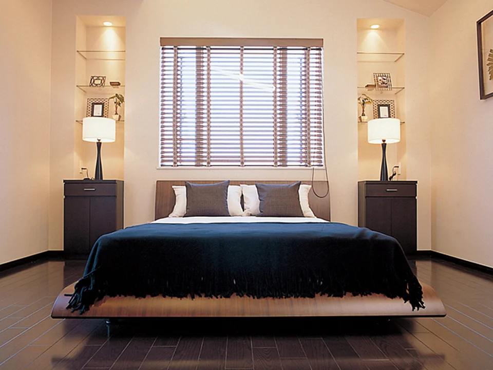 ダークな色調の床材をセレクトし、落ち着いた雰囲気をもたせた主寝室。書斎も併設され、ワンランク上の安らぎの時間を演出します。