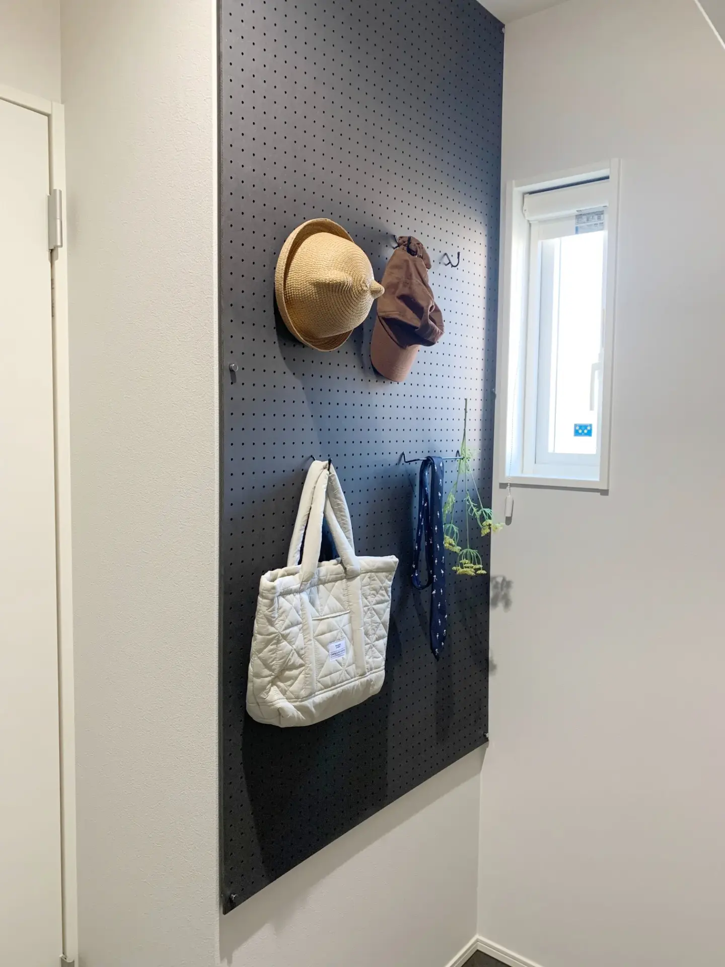 有孔ボードをつかってバッグや帽子などをおしゃれに収納。