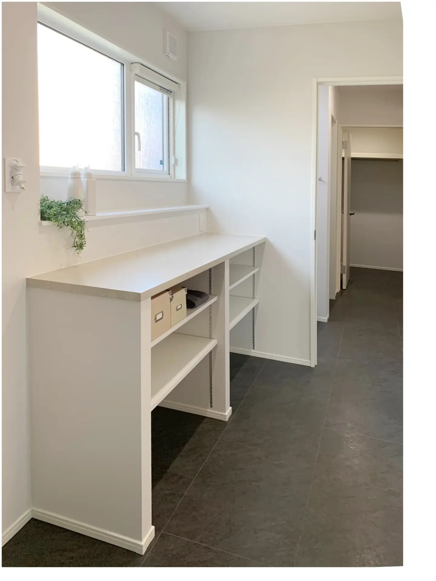 お洗濯のたたみやアイロンがけなどに重宝する作業台と収納棚。