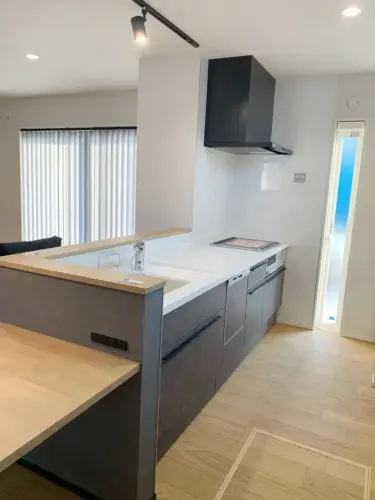 チタングレーに木目調の外壁でスタイリッシュな外観。