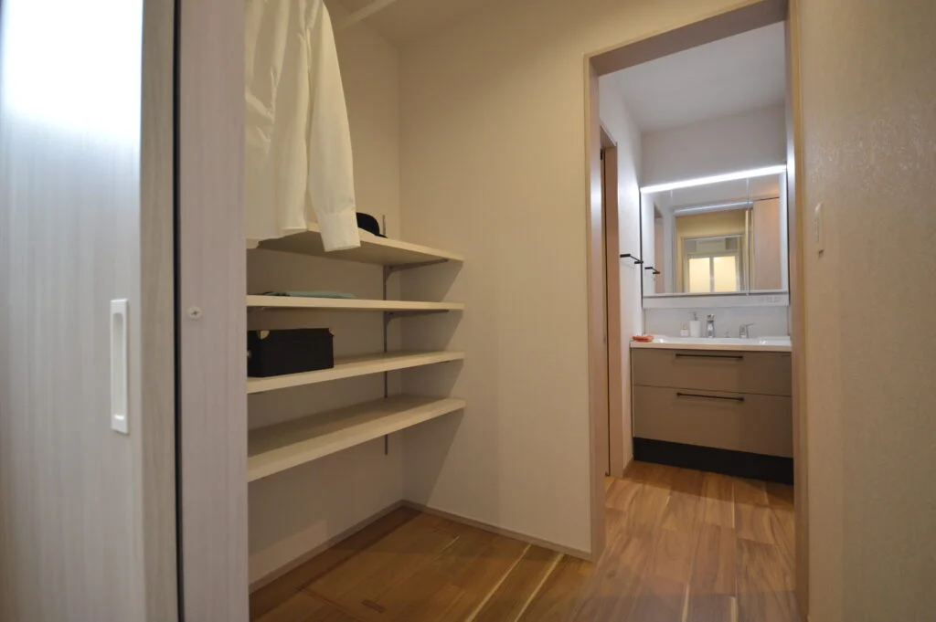 ファミリークロークは家族の衣類をまとめて収納でき、奥のランドリースペースで洗濯から収納まで一連の家事動線がスムーズ。効率的な暮らしを実現する機能的な設計です。