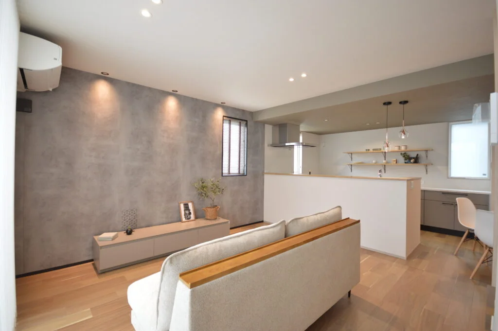 テレビを中心としたスタイリッシュなリビング。ゆったりとしたソファでくつろぎながら、家族団らんの時間を大切にできる落ち着いた空間設計です。